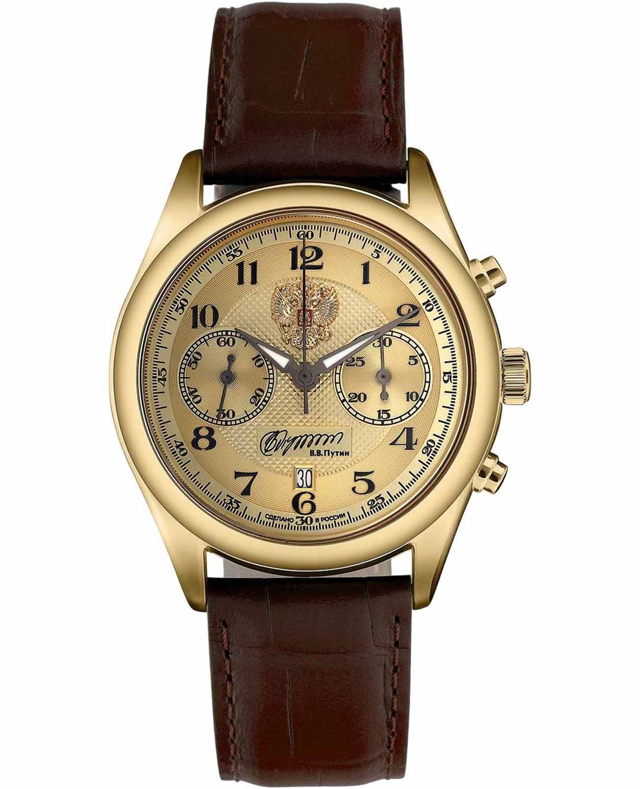 Российские механические часы-хронографХронографФункция позволяет измерять отрезки времени с особой точностью: часы, минуты, секунды. Верным признаком хронографа является наличие на циферблате 3 дополнительных окошек-счётчиков. с секундомеромСекундомерСекундоме́р — прибор, способный измерять интервалы времени с точностью до долей секунды. Слава 1889141/300-4617, созданные для тех, кто ценит стиль и надежность. Эти часы сочетают в себе классический дизайн и современные технологии, предлагая исключительную функциональность и элегантность. Часы оснащены механизмом Peacock 4617 с автоподзаводом, а запас хода достигает 45 часов, что делает их идеальным выбором для повседневного использования. Корпус часов диаметром 42 мм выполнен из стали с изысканным золотистым IP-покрытиемIP-покрытиеМетод ионного напыления. Демонстрирует повышенную устойчивость к истиранию, окислению и химическим веществам. Под воздействием высокого давления и температуры около 1500°C молекулы металла надёжно соединяются с частицами корпуса часов.. Золотистый циферблат украшен изображением герба Российской Федерации и дополнен арабскими цифрами, что обеспечивает отличную читаемость. Стрелки с люминесцентным покрытиемЛюминесцентное покрытиеПозволяет считывать показания времени в темноте. Производители наносят на стрелки, часовые индексы, безель или поверхность циферблата светонакопительный состав, дающий холодное свечение. облегчают чтение времени даже в условиях слабого освещения. Окошко даты расположено в положении 6 часов, добавляя дополнительную практичность. Защиту обеспечивает сапфировое стеклоСапфировое стеклоПрочный и надёжный материал из кристалла сапфира синтетического происхождения, характеризующийся особой твёрдостью и устойчивостью к царапинам и повреждениям., устойчивое к царапинам, и водозащита до 50WR, что позволяет носить часы в различных условиях. Рифленая заводная головка и кожаный ремешок с классической застежкой завершают образ, придавая часам дополнительную элегантность и комфорт.