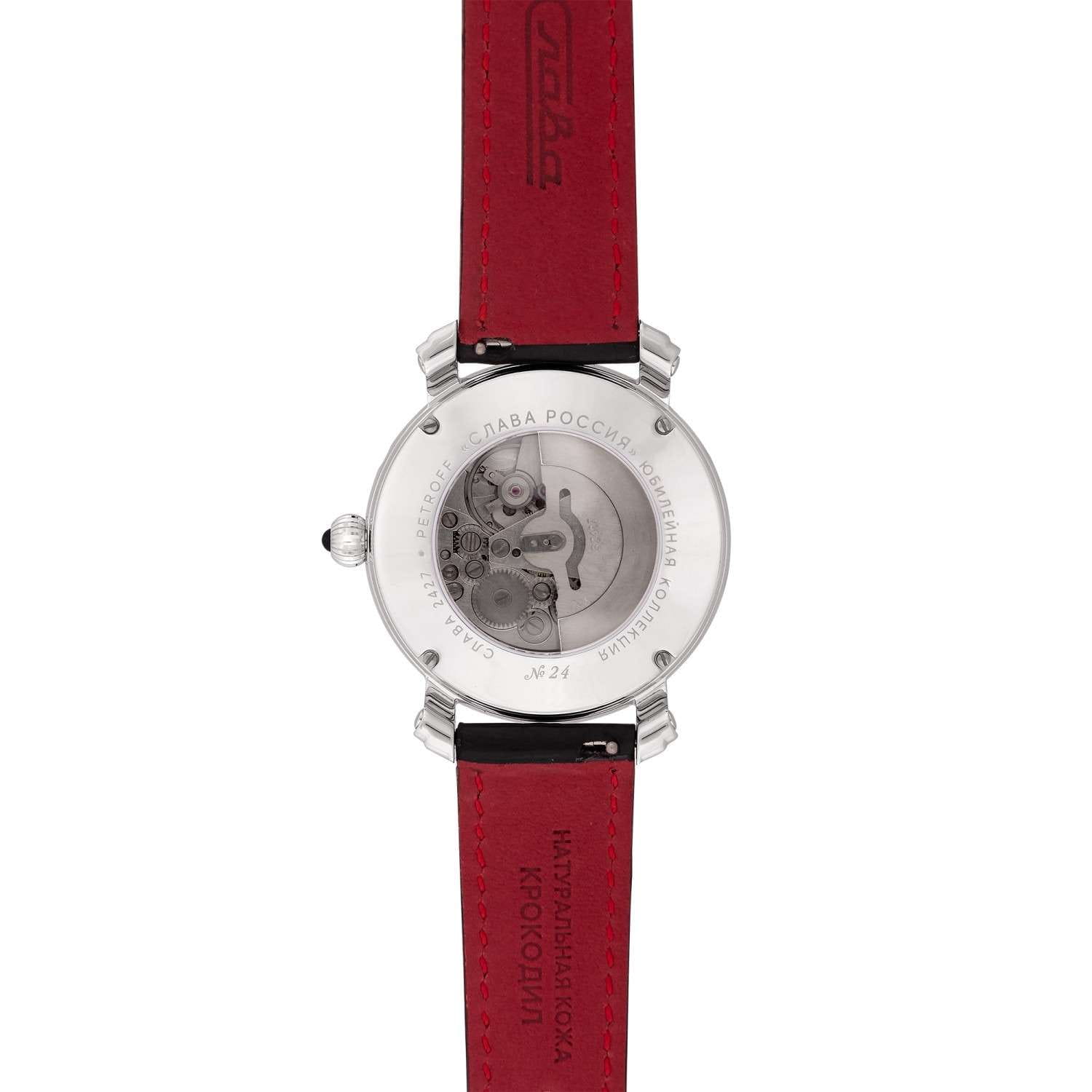 Наручные часы Слава Слава России 2440617/300-2427 — воплощение классического стиля и исключительного качества, произведенные в России. Эта модель из лимитированной коллекции, выпущенной в количестве всего 300 экземпляров, станет великолепным дополнением к вашему образу. Часы оснащены надежным механическим механизмом "Слава 2427" с автоподзаводом, обеспечивающим точный ход и оснащены двойным календарем, что позволяет всегда быть в курсе текущей даты. Корпус из нержавеющей стали с родиевым покрытием диаметром 41 мм и толщиной 14,2 мм отличается высокой прочностью и водозащитой до 5 ATM. Серебристо-бирюзовый циферблат с арабскими цифрами защищен сапфировым стекломСапфировое стеклоПрочный и надёжный материал из кристалла сапфира синтетического происхождения, характеризующийся особой твёрдостью и устойчивостью к царапинам и повреждениям., устойчивым к царапинам, что позволяет надолго сохранить безупречный вид часов. На 3 часах расположено окошко с указателем даты и дня недели. Кожаный ремень из крокодила с застежкой «бабочка»Застёжка "бабочка"Такой вид застёжки дополняется предохранителями, помогающими избежать случайного раскрытия браслета. Обладают изящным исполнением. добавляет элегантности и комфорта, создавая ощущение роскоши и изысканности. Эта модель станет идеальным выбором для тех, кто ценит традиции и высокое качество в сочетании с современным дизайном.