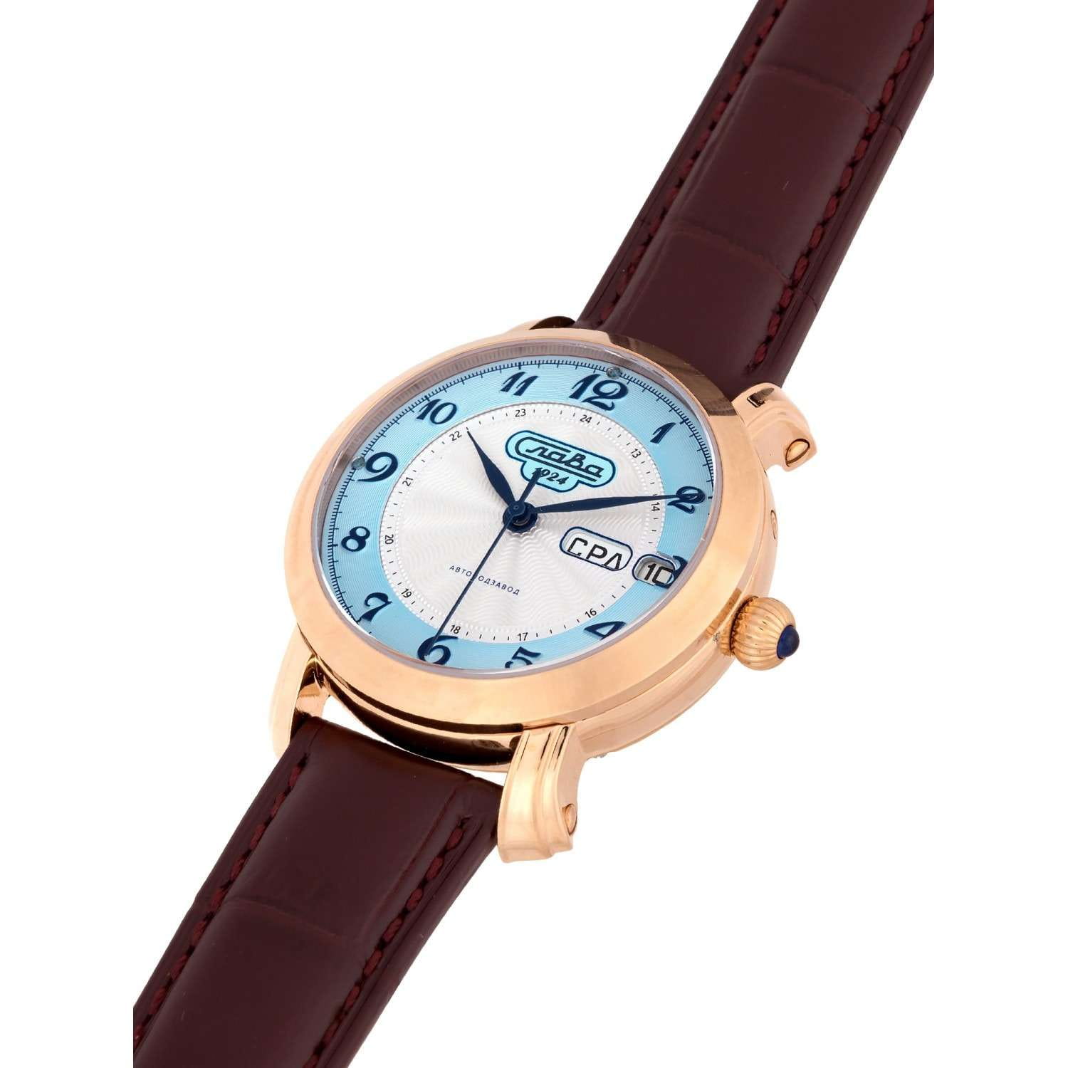 Наручные часы Слава Слава России 2443616/300-2427 — воплощение классического стиля и исключительного качества, произведенные в России. Эта модель из лимитированной коллекции, выпущенной в количестве всего 300 экземпляров, станет великолепным дополнением к вашему образу. Часы оснащены надежным механическим механизмом "Слава 2427" с автоподзаводом, обеспечивающим точный ход и оснащены двойным календарем, что позволяет всегда быть в курсе текущей даты. Корпус из нержавеющей стали с золотистым PVDPVDУльтратонкое покрытие наносится в технике вакуумного напыления, сочетает в себе нитрид титана особой прочности со слоем золота или оксида хрома. Несёт в себе декоративную или защитную функцию. покрытием диаметром 41 мм и толщиной 14,2 мм отличается высокой прочностью и водозащитой до 5 ATM. Серебристо-голубой циферблат с арабскими цифрами защищен сапфировым стекломСапфировое стеклоПрочный и надёжный материал из кристалла сапфира синтетического происхождения, характеризующийся особой твёрдостью и устойчивостью к царапинам и повреждениям., устойчивым к царапинам, что позволяет надолго сохранить безупречный вид часов. На 3 часах расположено окошко с указателем даты и дня недели. Кожаный ремень из крокодила с застежкой «бабочка»Застёжка "бабочка"Такой вид застёжки дополняется предохранителями, помогающими избежать случайного раскрытия браслета. Обладают изящным исполнением. добавляет элегантности и комфорта, создавая ощущение роскоши и изысканности. Эта модель станет идеальным выбором для тех, кто ценит традиции и высокое качество в сочетании с современным дизайном.