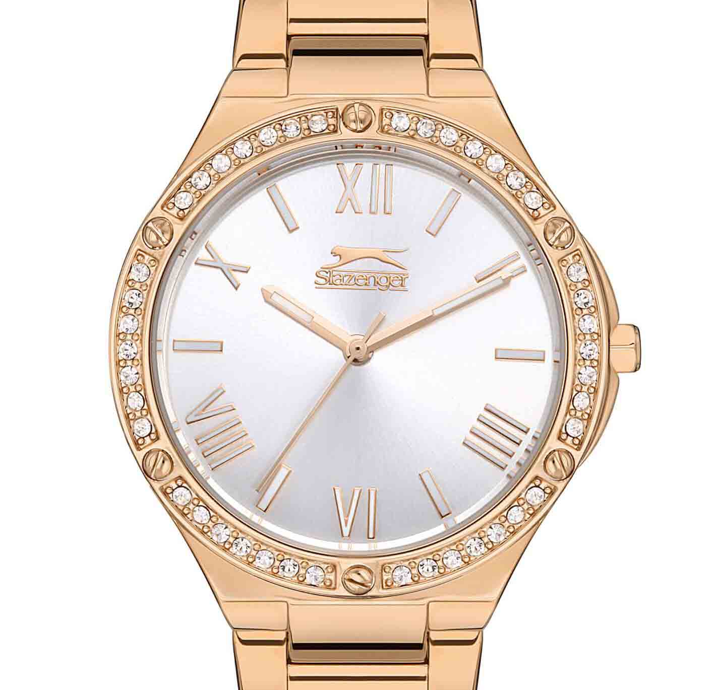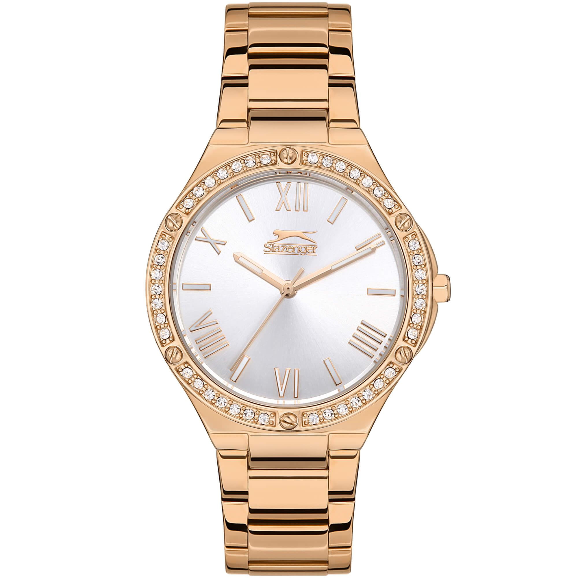 Женские часы Slazenger SL.09.2141.3.02 - это изысканный аксессуар, сочетающий в себе элегантность и функциональность. Модель оснащена надежным кварцевым механизмом и обладает водозащитой 3 АТМ, что позволяет не беспокоиться о случайных брызгах. Корпус часов диаметром 35 мм и толщиной 9 мм выполнен из прочного суперметалла с золотистым IP-покрытиемIP-покрытиеМетод ионного напыления. Демонстрирует повышенную устойчивость к истиранию, окислению и химическим веществам. Под воздействием высокого давления и температуры около 1500°C молекулы металла надёжно соединяются с частицами корпуса часов., а циферблат защищен минеральным стекломМинеральное стеклоМинеральное стекло представляет собой искусственно выращенный минерал кварца. Такое стекло отличается особой устойчивостью к повреждениям и царапинам. Уступает по некоторым качествам сапфировому стеклу.. БезельБезельВнешний ободок, закрепляющий стекло. В спортивных часах так называется поворотное кольцо с делениями на циферблате, выполняет роль таймера – замеряет отрезки времени на шкале. Неподвижный безель – элемент декора. Однонаправленно вращающийся безель на дайверских часах позволяет фиксировать моменты погружения и выныривания на поверхность. инкрустирован фианитами. Браслет, также изготовленный из суперметалла с IP-покрытиемIP-покрытиеМетод ионного напыления. Демонстрирует повышенную устойчивость к истиранию, окислению и химическим веществам. Под воздействием высокого давления и температуры около 1500°C молекулы металла надёжно соединяются с частицами корпуса часов., имеет раскладную застёжкуРаскладная застёжкаТакой тип застёжки используется только на браслетах из металла. Она никогда не раскрывается полностью, происходит разделение на 2 и более частей. Раскладывающая застёжка снизит вероятность потери часов к минимуму., что подчеркивает современный стиль и позволяет легко снимать часы. Особую привлекательность часам придают декоративные элементы в виде фианитов. Весом всего 90 грамм, эти часы станут легким и стильным дополнением к любому образу.