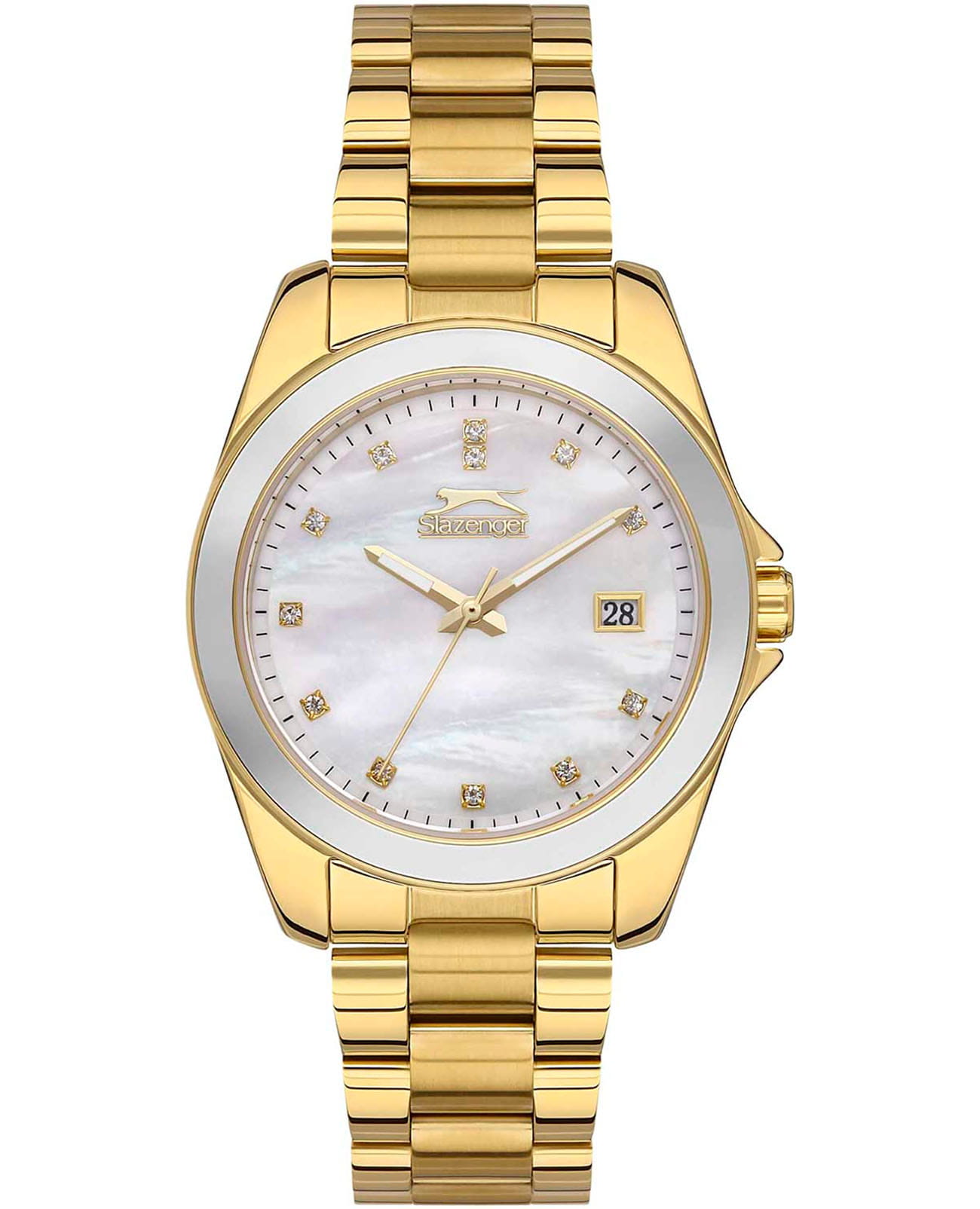 Женские наручные часы Slazenger SL.09.2142.3.05 сочетают в себе элегантный дизайн и надежность современных технологий. Модель обладает круглым корпусом диаметром 37 мм, изготовленным из суперметалла, что обеспечивает высокую устойчивость к внешним воздействиям. Браслет выполнен на раскладной застёжкеРаскладная застёжкаТакой тип застёжки используется только на браслетах из металла. Она никогда не раскрывается полностью, происходит разделение на 2 и более частей. Раскладывающая застёжка снизит вероятность потери часов к минимуму., гарантирует комфортное ношение и безопасность. Циферблат перламутрового цвета декорирован кристаллами и стрелками с  люминесцентным покрытиемЛюминесцентное покрытиеПозволяет считывать показания времени в темноте. Производители наносят на стрелки, часовые индексы, безель или поверхность циферблата светонакопительный состав, дающий холодное свечение., которые обеспечивают читаемость времени даже в условиях недостаточной освещенности. Для защиты используется минеральное стеклоМинеральное стеклоМинеральное стекло представляет собой искусственно выращенный минерал кварца. Такое стекло отличается особой устойчивостью к повреждениям и царапинам. Уступает по некоторым качествам сапфировому стеклу., обеспечивающее прочную защиту от царапин. Браслет и корпус часов из суперметалла с IP-покрытиемIP-покрытиеМетод ионного напыления. Демонстрирует повышенную устойчивость к истиранию, окислению и химическим веществам. Под воздействием высокого давления и температуры около 1500°C молекулы металла надёжно соединяются с частицами корпуса часов.. Часы работают на кварцевом механизме, что гарантирует точное время без необходимости подзаводки. Модель также оснащена функцией отображения даты, делая ее практичной для повседневного использования. Водонепроницаемость часов достигает 50 атмосфер , что позволяет использовать их во время плавания, однако не рекомендуется для дайвинга или других водных видов спорта.