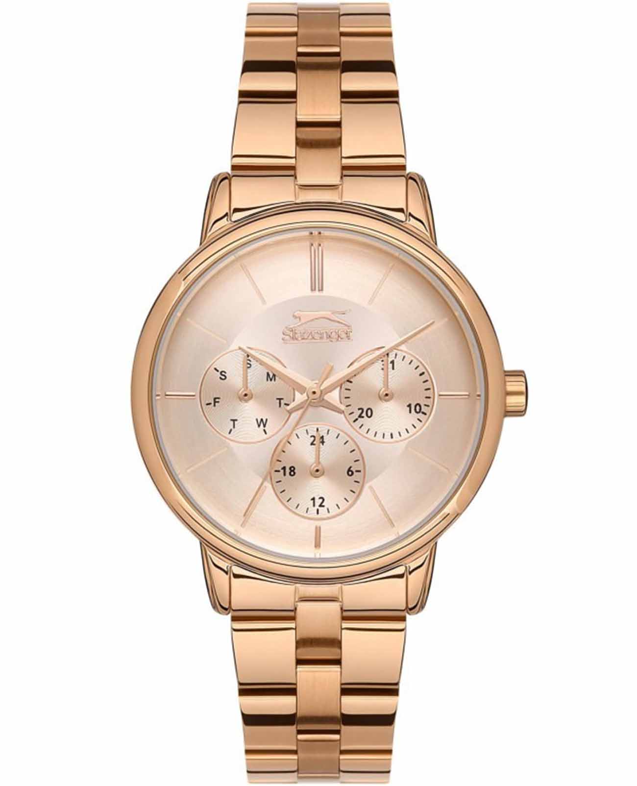 Эти элегантные женские часы Slazenger SL.09.2145.4.04 идеально подойдут для тех, кто ценит стиль и функциональность. Произведенные в Англии, они оснащены надежным кварцевым механизмом, который обеспечивает точное время. Корпус и браслет часов выполнены из металла с розово-золотистым IP-покрытиемIP-покрытиеМетод ионного напыления. Демонстрирует повышенную устойчивость к истиранию, окислению и химическим веществам. Под воздействием высокого давления и температуры около 1500°C молекулы металла надёжно соединяются с частицами корпуса часов., придающего изделию современный и изысканный вид. Минеральное стеклоМинеральное стеклоМинеральное стекло представляет собой искусственно выращенный минерал кварца. Такое стекло отличается особой устойчивостью к повреждениям и царапинам. Уступает по некоторым качествам сапфировому стеклу. защищает золотистый циферблат от царапин и повреждений, а водозащита уровня WR 30 позволяет использовать часы в условиях повышенной влажности.  Диаметр корпуса составляет 35 мм, а толщина — 9 мм, что делает их аккуратными и утонченными, идеально подходящими для женского запястья. Ширина браслета равна 16 мм, и он оснащен раскладной застёжкойРаскладная застёжкаТакой тип застёжки используется только на браслетах из металла. Она никогда не раскрывается полностью, происходит разделение на 2 и более частей. Раскладывающая застёжка снизит вероятность потери часов к минимуму. для удобства ношения. Часы оснащены дополнительными функциями: на малых циферблатах отображаются дата и день недели, а также текущее время в 24-часовом формате, что добавляет удобства в использовании. Эти часы станут отличным дополнением к любому образу, подчеркивая вашу индивидуальность и утонченность.