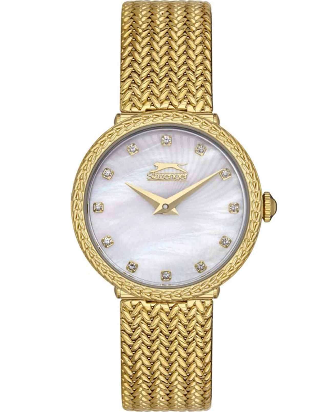 Элегантные женские часы Slazenger SL.09.2148.3.04 — это сочетание изысканного дизайна и надежной функциональности. Эти кварцевые часы подчеркнут ваш утонченный стиль. Корпус диаметром 28 мм выполнен из суперметалла с золотистым IP-покрытиемIP-покрытиеМетод ионного напыления. Демонстрирует повышенную устойчивость к истиранию, окислению и химическим веществам. Под воздействием высокого давления и температуры около 1500°C молекулы металла надёжно соединяются с частицами корпуса часов., что обеспечивает прочность и долговечность, а толщина корпуса всего 7 мм делает их изящными и аккуратными на запястье. Особое внимание привлекает перламутровый циферблат, украшенный сияющими кристаллами, которые добавляют нотку роскоши и блеска. Золотистый плетеный браслет с IP-покрытиемIP-покрытиеМетод ионного напыления. Демонстрирует повышенную устойчивость к истиранию, окислению и химическим веществам. Под воздействием высокого давления и температуры около 1500°C молекулы металла надёжно соединяются с частицами корпуса часов. шириной 14 мм гармонично дополняет общий облик и обеспечивает комфорт при носке, а раскладной замокРаскладной замокДанный вариант застежки используется только на часах с металлическим браслетом. Отличительная особенность такого крепления в том, что длина браслета становится универсальной и вы можете самостоятельно отрегулировать нужный вам размер – застежка просто двигается по браслету часов. обеспечивает комфортное ношение и надежную фиксацию на запястье. Часы весят всего 41 грамм, что делает их практически невесомыми на руке. Минеральное стеклоМинеральное стеклоМинеральное стекло представляет собой искусственно выращенный минерал кварца. Такое стекло отличается особой устойчивостью к повреждениям и царапинам. Уступает по некоторым качествам сапфировому стеклу. защищает циферблат от возможных повреждений, а водозащита уровня WR 30 позволяет использовать часы при случайных контактах с водой, например, при дожде или мытье рук. Эти часы станут идеальным выбором для женщин, которые ценят стиль и качество, и хотят подчеркнуть свою индивидуальность с помощью утонченных аксессуаров.
