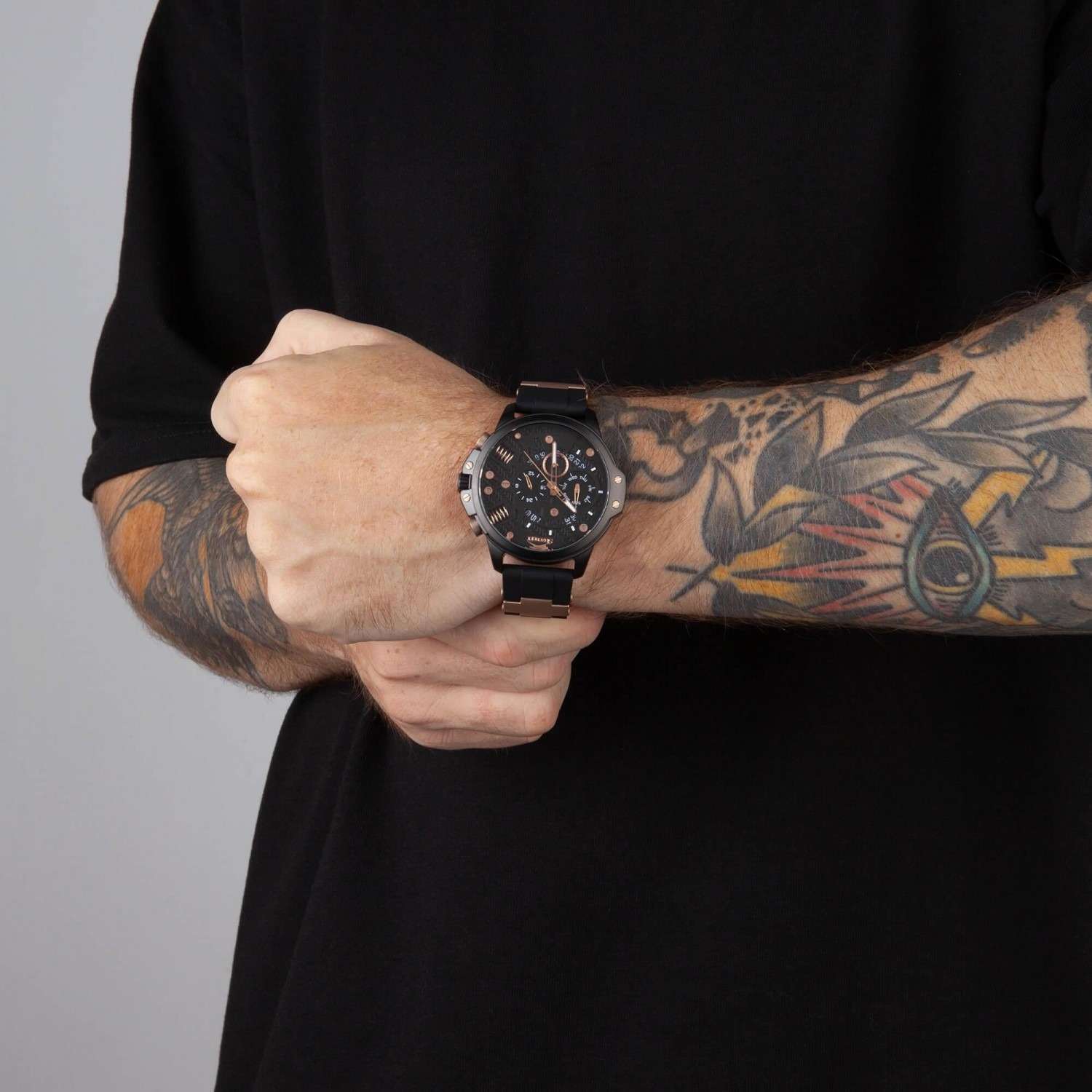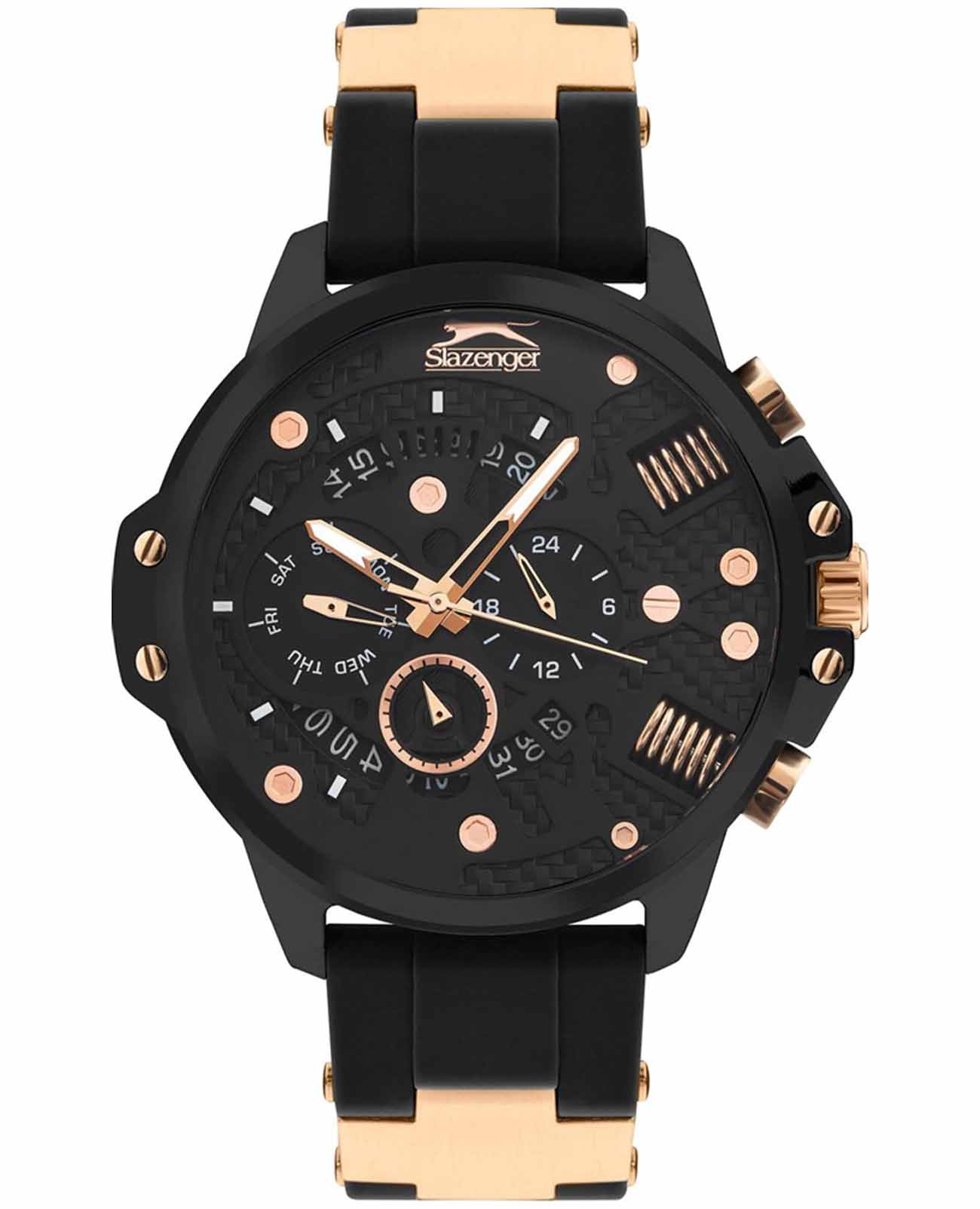 Часы Slazenger SL.09.2212.2.03 представляют собой стильный и функциональный аксессуар, созданный для современных мужчин, ценящих качество и надежность. Они оснащены кварцевым механизмом, который обеспечивает точность хода и минимальную необходимость в обслуживании. Люминесцентное покрытиеЛюминесцентное покрытиеПозволяет считывать показания времени в темноте. Производители наносят на стрелки, часовые индексы, безель или поверхность циферблата светонакопительный состав, дающий холодное свечение. на стрелках и метках обеспечивает отличную видимость в темноте. Благодаря водозащите уровня WR 50 (5 ATM), эти часы отлично справляются с воздействием влаги, что делает их подходящими для повседневного ношения и активного образа жизни. Минеральное стеклоМинеральное стеклоМинеральное стекло представляет собой искусственно выращенный минерал кварца. Такое стекло отличается особой устойчивостью к повреждениям и царапинам. Уступает по некоторым качествам сапфировому стеклу. защищает циферблат от царапин и повреждений, гарантируя долгий срок службы. Корпус часов диаметром 47 мм и толщиной 13 мм выполнен из прочного суперметалла с черным IP-покрытиемIP-покрытиеМетод ионного напыления. Демонстрирует повышенную устойчивость к истиранию, окислению и химическим веществам. Под воздействием высокого давления и температуры около 1500°C молекулы металла надёжно соединяются с частицами корпуса часов., что придаёт им стильный и современный вид. Силиконовый черный браслет, дополненный элементами из суперметалла с золотистым IP-покрытиемIP-покрытиеМетод ионного напыления. Демонстрирует повышенную устойчивость к истиранию, окислению и химическим веществам. Под воздействием высокого давления и температуры около 1500°C молекулы металла надёжно соединяются с частицами корпуса часов., обеспечивает комфорт при носке и надёжно фиксирует часы на запястье, а его размеры (22-20 мм) подходят для большинства мужчин. Часы оснащены рядом полезных функций, таких как индикация даты, дня недели и 24-часовой указатель времени, что делает их не только стильным, но и практичным аксессуаром. Вес модели составляет 110 г, что делает их лёгкими и удобными для ежедневного ношения.