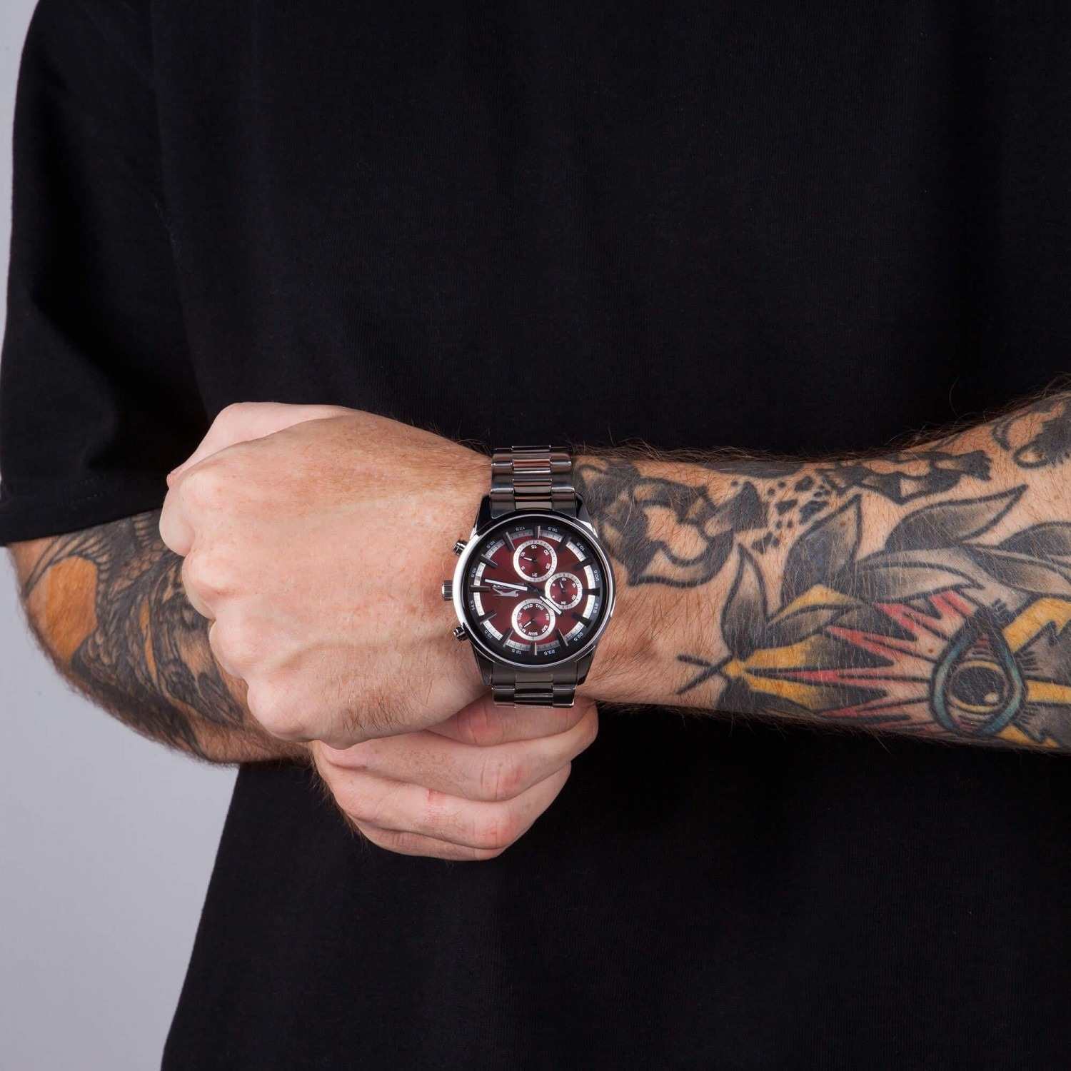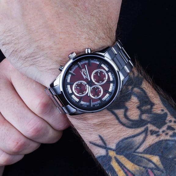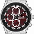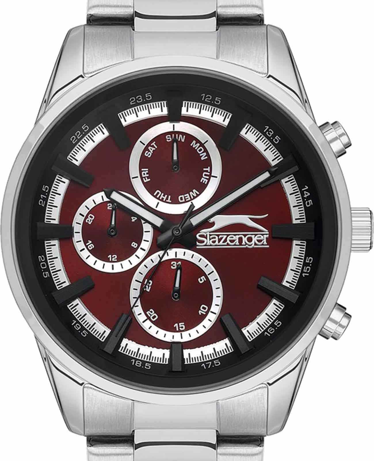 Часы Slazenger SL.09.2242.2.06 – это стильная и надежная модель, созданная для современных мужчин, ценящих качество и функциональность. Корпус и браслет выполнены из прочного металла серебряного цвета, что придает аксессуару элегантный внешний вид и обеспечивает долговечность. Часы фиксируются на руке с помощью браслета с удобной раскладной застёжкойРаскладная застёжкаТакой тип застёжки используется только на браслетах из металла. Она никогда не раскрывается полностью, происходит разделение на 2 и более частей. Раскладывающая застёжка снизит вероятность потери часов к минимуму.. Кварцевый механизм гарантирует точность хода, а минеральное стеклоМинеральное стеклоМинеральное стекло представляет собой искусственно выращенный минерал кварца. Такое стекло отличается особой устойчивостью к повреждениям и царапинам. Уступает по некоторым качествам сапфировому стеклу. защищает бордовый циферблат от царапин и повреждений. Диаметр корпуса составляет 46 мм, толщина – 13 мм, ширина ремешка – 24 мм, а вес часов – 146 грамм, что делает их удобными для повседневного ношения. Водозащита уровня WR 50 позволяет не снимать часы во время мытья рук и при незначительном контакте с водой. Для удобства использования в темное время суток предусмотрено люминесцентное покрытиеЛюминесцентное покрытиеПозволяет считывать показания времени в темноте. Производители наносят на стрелки, часовые индексы, безель или поверхность циферблата светонакопительный состав, дающий холодное свечение. стрелок. Модель оснащена дополнительными циферблатами, отображающими дату, день недели и текущее время в 24-часовом формате.