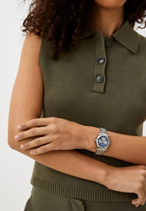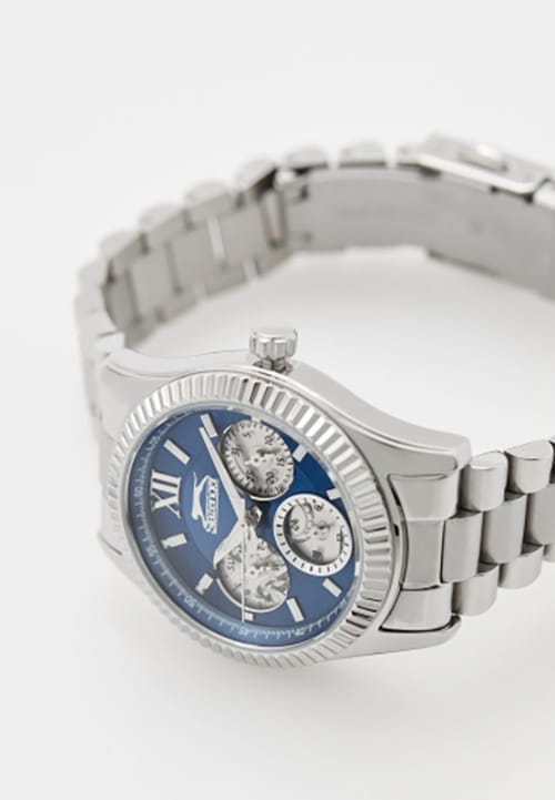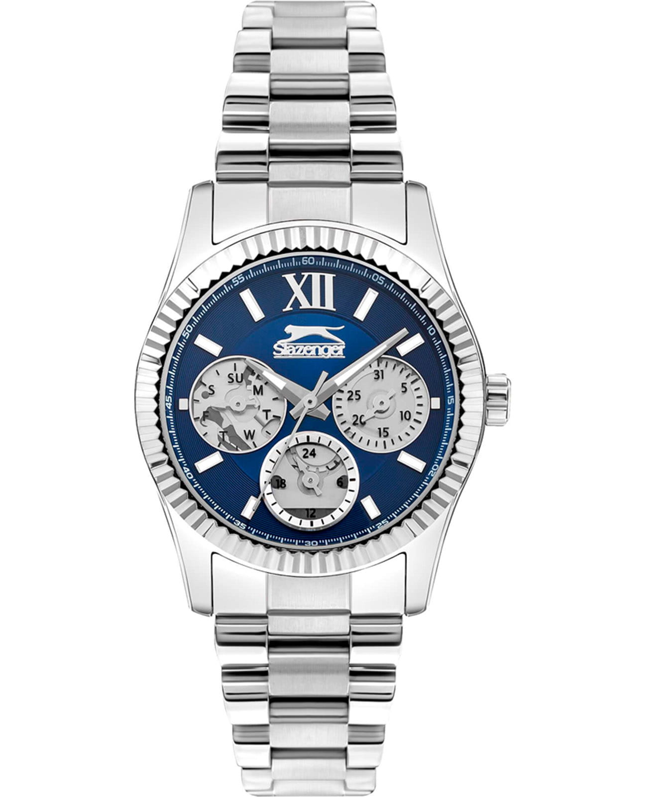 Женские кварцевые часы Slazenger SL.09.2317.4.01 — это выразительный и функциональный аксессуар, сочетающий стиль, прочность и насыщенную комплектацию. Корпус и браслет выполнены из суперметалла. Циферблат синего цвета защищён минеральным стекломМинеральное стеклоМинеральное стекло представляет собой искусственно выращенный минерал кварца. Такое стекло отличается особой устойчивостью к повреждениям и царапинам. Уступает по некоторым качествам сапфировому стеклу. и оформлен с вынесенными малыми циферблатами для индикации дня недели, даты и времени в 24-часовом формате. Стрелки и метки оснащены люминесцентным покрытиемЛюминесцентное покрытиеПозволяет считывать показания времени в темноте. Производители наносят на стрелки, часовые индексы, безель или поверхность циферблата светонакопительный состав, дающий холодное свечение., обеспечивающим хорошую читаемость в темноте. Браслет из суперметалла фиксируется на раскладной застёжкеРаскладная застёжкаТакой тип застёжки используется только на браслетах из металла. Она никогда не раскрывается полностью, происходит разделение на 2 и более частей. Раскладывающая застёжка снизит вероятность потери часов к минимуму., обеспечивая удобство и надёжность ношения. Водонепроницаемость 30 м позволяет использовать часы в повседневных условиях, защищая от случайных брызг и капель дождя. Модель подчёркивает индивидуальность владельца и идеально подходит как для повседневного, так и для торжественного образа.