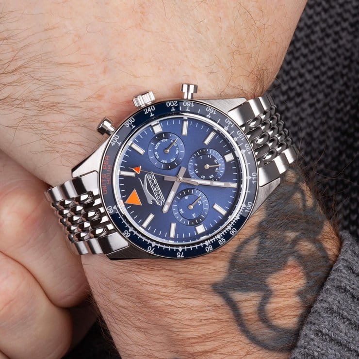 Мужские кварцевые часы Slazenger SL.09.2360.2.03 – идеальное сочетание классического дизайна и современных технологий, созданное для уверенных в себе мужчин. Корпус выполнен из суперметалла серебристого цвета, диаметром 43 мм и толщиной 12 мм, подчёркивает надежность модели и делает их идеальным аксессуаром для любой ситуации – будь то деловая встреча или повседневные выходы. Циферблат надёжно защищён минеральным стекломМинеральное стеклоМинеральное стекло представляет собой искусственно выращенный минерал кварца. Такое стекло отличается особой устойчивостью к повреждениям и царапинам. Уступает по некоторым качествам сапфировому стеклу., которое устойчиво к механическим повреждениям и сохраняет кристальную прозрачность. Неподвижный безельБезельВнешний ободок, закрепляющий стекло. В спортивных часах так называется поворотное кольцо с делениями на циферблате, выполняет роль таймера – замеряет отрезки времени на шкале. Неподвижный безель – элемент декора. Однонаправленно вращающийся безель на дайверских часах позволяет фиксировать моменты погружения и выныривания на поверхность. с IP-покрытиемIP-покрытиеМетод ионного напыления. Демонстрирует повышенную устойчивость к истиранию, окислению и химическим веществам. Под воздействием высокого давления и температуры около 1500°C молекулы металла надёжно соединяются с частицами корпуса часов. синего цвета. Стальной браслет на раскладной застёжкеРаскладная застёжкаТакой тип застёжки используется только на браслетах из металла. Она никогда не раскрывается полностью, происходит разделение на 2 и более частей. Раскладывающая застёжка снизит вероятность потери часов к минимуму. удобно облегает запястье, обеспечивая надёжность и комфорт в повседневном ношении. Стрелки и метки покрыты люминесцентным покрытиемЛюминесцентное покрытиеПозволяет считывать показания времени в темноте. Производители наносят на стрелки, часовые индексы, безель или поверхность циферблата светонакопительный состав, дающий холодное свечение., обеспечивающим отличную читаемость в темноте. Эти часы станут не просто аксессуаром, а надежным спутником в любой ситуации, подчеркивая ваш безупречный вкус и деловой стиль. Вынесенный циферблат с 24-х часовым указателем времени и функция тахиметраТахиметрРазмеченная шкала, располагается на ободке или безеле часов. Тахиметр позволяет рассчитать скорость на определённом участке пути, расстояние измеряется в километрах или милях.. Водозащита 50 метров позволит защитить корпус от случайных брызг или капель дождя.
