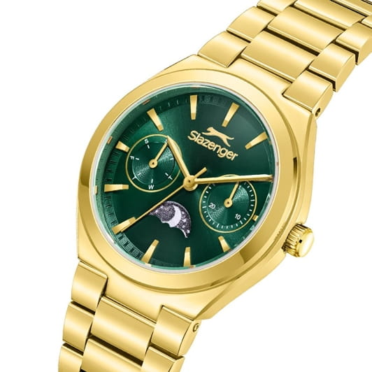 Женские кварцевые часы Slazenger — это выразительный и функциональный аксессуар. Корпус диаметром 34 мм и толщиной 9,5 мм выполнен из суперметалла с IP-покрытиемIP-покрытиеМетод ионного напыления. Демонстрирует повышенную устойчивость к истиранию, окислению и химическим веществам. Под воздействием высокого давления и температуры около 1500°C молекулы металла надёжно соединяются с частицами корпуса часов.. Циферблат зелёного цвета оформлен индексами и стрелками. Циферблат защищён минеральным стекломМинеральное стеклоМинеральное стекло представляет собой искусственно выращенный минерал кварца. Такое стекло отличается особой устойчивостью к повреждениям и царапинам. Уступает по некоторым качествам сапфировому стеклу.. Механизм — кварцевый калибр VX3HE11. Часы оснащены индикацией дня недели, даты и индикатором день/ночь, отображающим солнце или луну в зависимости от времени суток. Часы оснащены браслетом из суперметалла с IP-покрытиемIP-покрытиеМетод ионного напыления. Демонстрирует повышенную устойчивость к истиранию, окислению и химическим веществам. Под воздействием высокого давления и температуры около 1500°C молекулы металла надёжно соединяются с частицами корпуса часов. и раскладной застёжкойРаскладная застёжкаТакой тип застёжки используется только на браслетах из металла. Она никогда не раскрывается полностью, происходит разделение на 2 и более частей. Раскладывающая застёжка снизит вероятность потери часов к минимуму.. Водонепроницаемость 50 м позволяет использовать часы в повседневных условиях. Гарантия — 12 месяцев. Идеальный выбор для тех, кто ценит стиль, функциональность и качество.