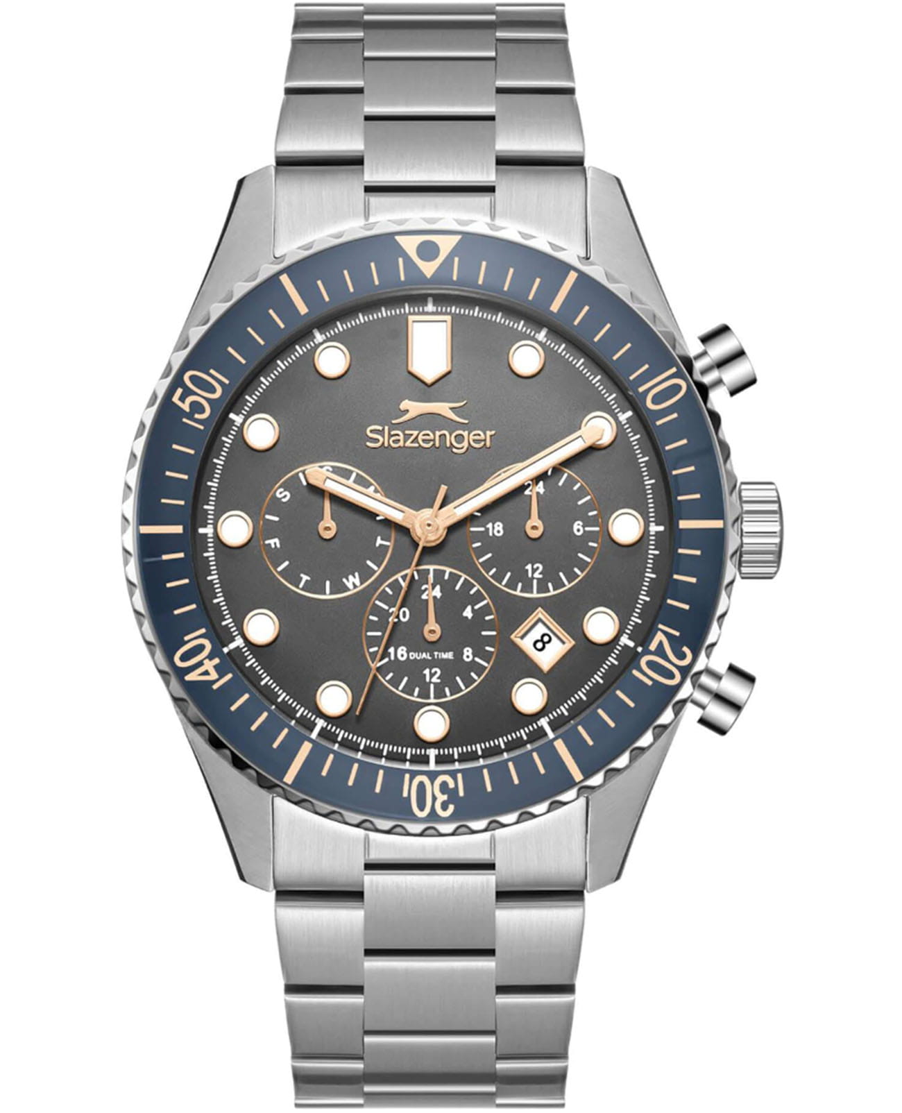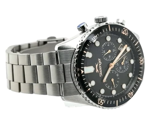 Мужские кварцевые часы Slazenger — это выразительный и функциональный аксессуар. Корпус диаметром 43 мм и толщиной 12 мм выполнен из нержавеющей стали 316L. Циферблат чёрного цвета оформлен индексами и стрелками. Циферблат защищён минеральным стекломМинеральное стеклоМинеральное стекло представляет собой искусственно выращенный минерал кварца. Такое стекло отличается особой устойчивостью к повреждениям и царапинам. Уступает по некоторым качествам сапфировому стеклу.. Механизм — кварцевый. Часы оснащены индикацией дня недели, даты, 12/24-часового формата времени и функцией второго часового пояса (GMT)Второй часовой поясФункция, позволяющая отображать время двух часовых поясов одновременно.. Окошко даты расположено между 4 и 5 часами. Стрелки и метки с люминесцентным покрытиемЛюминесцентное покрытиеПозволяет считывать показания времени в темноте. Производители наносят на стрелки, часовые индексы, безель или поверхность циферблата светонакопительный состав, дающий холодное свечение., обеспечивающим хорошую читаемость в темноте. БезельБезельВнешний ободок, закрепляющий стекло. В спортивных часах так называется поворотное кольцо с делениями на циферблате, выполняет роль таймера – замеряет отрезки времени на шкале. Неподвижный безель – элемент декора. Однонаправленно вращающийся безель на дайверских часах позволяет фиксировать моменты погружения и выныривания на поверхность. с IP-покрытиемIP-покрытиеМетод ионного напыления. Демонстрирует повышенную устойчивость к истиранию, окислению и химическим веществам. Под воздействием высокого давления и температуры около 1500°C молекулы металла надёжно соединяются с частицами корпуса часов.. Часы оснащены стальным браслетом с раскладной застёжкойРаскладная застёжкаТакой тип застёжки используется только на браслетах из металла. Она никогда не раскрывается полностью, происходит разделение на 2 и более частей. Раскладывающая застёжка снизит вероятность потери часов к минимуму.. Водонепроницаемость 100 м позволяет использовать часы для плавания и повседневного ношения. Гарантия — 12 месяцев. Идеальный выбор для тех, кто ценит стиль, функциональность и качество.