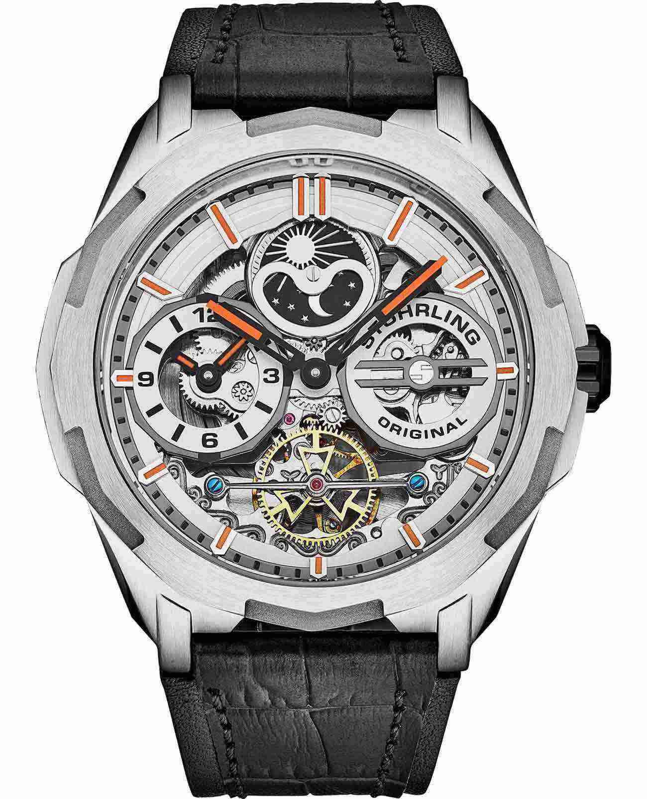 Мужские наручные часы Stuhrling Original 1012.01 сочетают в себе надежность и стильный дизайн, идеально подходящий для активного образа жизни . Модель обладает круглым корпусом диаметром 46 мм, изготовленным из нержавеющей стали, что обеспечивает повышенную устойчивость к внешним воздействиям . Ремешок выполнен из кожи на стандартной застежке, гарантирующей комфортное ношение и безопасность. Скелетонизированный циферблат оснащен люминесцентным покрытиемЛюминесцентное покрытиеПозволяет считывать показания времени в темноте. Производители наносят на стрелки, часовые индексы, безель или поверхность циферблата светонакопительный состав, дающий холодное свечение. стрелок и маркеров, обеспечивающим высокую читаемость даже в условиях плохой видимости под водой . Для защиты циферблата используется стекло KrysternaKrysternaKrysterna — инновационное стекло для наручных часов. Благодаря уникальной структуре, Krysterna объединяет ключевые преимущества двух материалов: твердость сапфира, защищающую от царапин, и гибкость минерального стекла, обеспечивающую устойчивость к деформациям. Такая комбинация делает его идеальным решением для часов, подверженных экстремальным нагрузкам, сохраняя при этом оптическую прозрачность., которое надежно защищает от царапин и механических повреждений. Часы работают на механическом механизме с автоподзаводом, что гарантирует точное время без необходимости ручного завода. Модель предлагает базовые функции: отображение времени и даты, а также водонепроницаемость до 5 атмосфер (50 метров), что позволяет использовать их в повседневных условиях, включая случайные контакты с водой, такие как мытье рук или дождь. Ударопрочный корпус и эргономичный дизайн делают эти часы идеальным выбором для любителей активного отдыха и профессионалов.