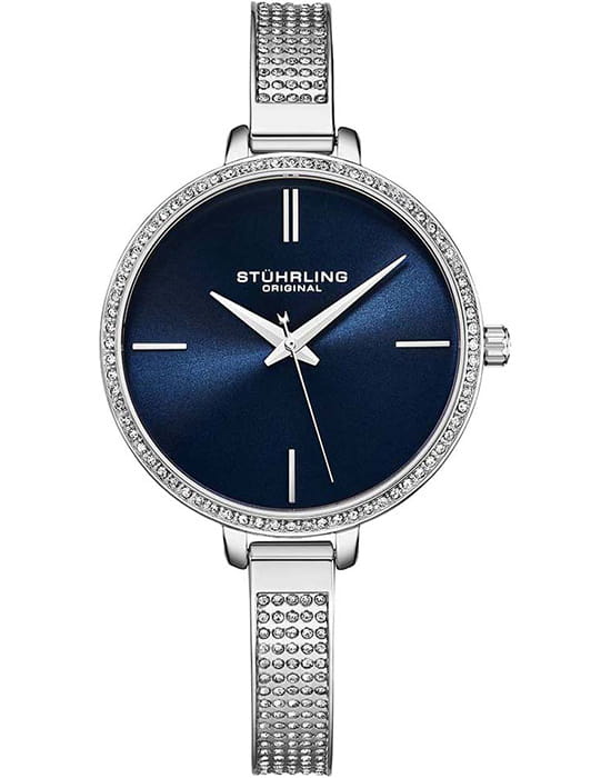 Stuhrling Vogue 3949.1 — изысканные женские часы, в которых сочетаются утончённость и современная элегантность. Тонкий корпус из нержавеющей стали украшен сверкающими кристаллами, создающими изящный блеск при каждом движении. Глубокий синий циферблат с эффектом солнечных лучей подчёркивает минималистичный дизайн и чистоту линий. Защиту от царапин обеспечивает стекло KrysternaKrysternaKrysterna — инновационное стекло для наручных часов. Благодаря уникальной структуре, Krysterna объединяет ключевые преимущества двух материалов: твердость сапфира, защищающую от царапин, и гибкость минерального стекла, обеспечивающую устойчивость к деформациям. Такая комбинация делает его идеальным решением для часов, подверженных экстремальным нагрузкам, сохраняя при этом оптическую прозрачность., сохраняющее безупречную прозрачность. Стальной браслет с ювелирной застежкой комфортно облегает запястье и придаёт часам завершённый ювелирный облик. Stuhrling Vogue — символ женственности, сияния и вкуса в каждой детали.