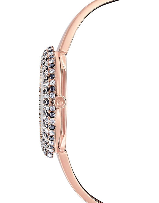 Женские часы Swarovski Crystal Rose 5484050 – это элегантные и утончённые часы, отличающиеся непревзойдённым сиянием.  БезельБезельВнешний ободок, закрепляющий стекло. В спортивных часах так называется поворотное кольцо с делениями на циферблате, выполняет роль таймера – замеряет отрезки времени на шкале. Неподвижный безель – элемент декора. Однонаправленно вращающийся безель на дайверских часах позволяет фиксировать моменты погружения и выныривания на поверхность. украшен микропаве из 215 кристаллов. Завершающие штрихи уникального дизайна – корпус и браслет из нержавеющей стали с PVDPVDУльтратонкое покрытие наносится в технике вакуумного напыления, сочетает в себе нитрид титана особой прочности со слоем золота или оксида хрома. Несёт в себе декоративную или защитную функцию. покрытием оттенка розового золота и черный циферблат с рисунком в виде солнечных лучей и тремя метками из прозрачных кристаллов. Надежное минеральное стеклоМинеральное стеклоМинеральное стекло представляет собой искусственно выращенный минерал кварца. Такое стекло отличается особой устойчивостью к повреждениям и царапинам. Уступает по некоторым качествам сапфировому стеклу. защищает часы от царапин и долго сохраняет первоначальный внешний вид. Водозащита 50 метров делает часы практичными для повседневного использования.