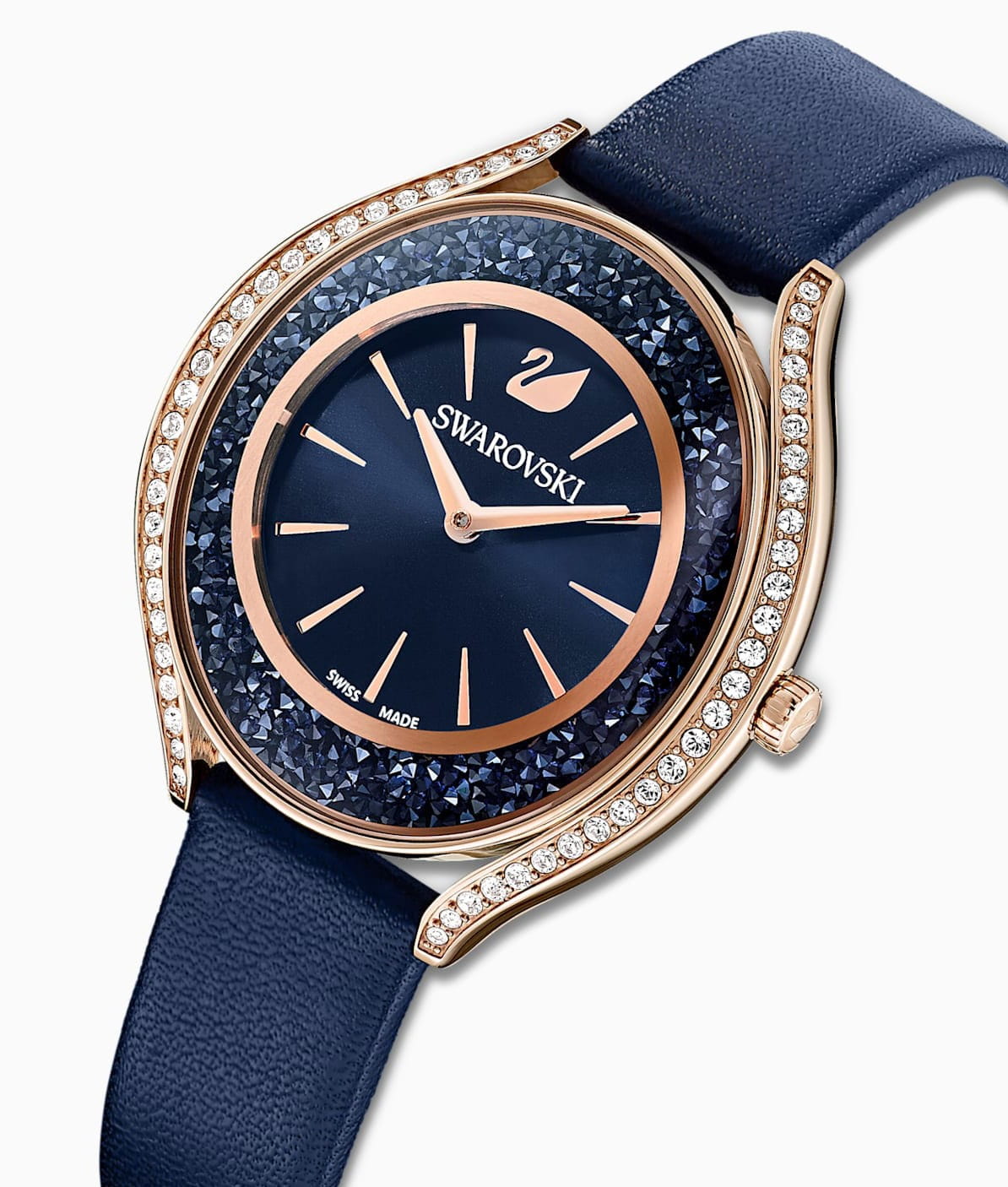 Swarovski 5519447 — элегантные женские часы из коллекции Crystalline Aura, сочетающие изысканный дизайн с высоким качеством. Корпус диаметром 35,5 мм выполнен из нержавеющей стали с розовым PVD-покрытиемPVDУльтратонкое покрытие наносится в технике вакуумного напыления, сочетает в себе нитрид титана особой прочности со слоем золота или оксида хрома. Несёт в себе декоративную или защитную функцию., что обеспечивает долговечность и элегантный вид. Минеральное стеклоМинеральное стеклоМинеральное стекло представляет собой искусственно выращенный минерал кварца. Такое стекло отличается особой устойчивостью к повреждениям и царапинам. Уступает по некоторым качествам сапфировому стеклу. защищает циферблат от царапин. Корпус украшен более чем 1300 кристаллами Swarovski, создающими роскошный блеск. Синий циферблат с изящными золотистыми метками и стрелками подчёркивает утончённость дизайна. Логотип Swarovski в виде лебедя расположен на отметке «12 часов». Часы оснащены швейцарским кварцевым механизмом, обеспечивающим точный ход. Ремешок из итальянской телячьей кожи синего цвета гарантирует комфортное ношение. Классическая застёжка обеспечивает надёжную фиксацию. Водозащита до 5 ATM (50 метров) делает часы подходящими для повседневного использования. Swarovski 5519447 — это идеальный выбор для женщин, ценящих утончённый стиль, функциональность и комфорт.