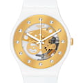 Часы Swatch SO29W105 —  эффектный и удобный аксессуар. Современный взгляд на классику. Часы имеют белый корпус из биоматериала, золотистое оформление прозрачного циферблата и кристаллы в качестве индексов. Ремешок из силикона на стандартной застёжке. Внутри часов установлен надежный кварцевый механизм, который обеспечивает точность хода. Эти часы водонепроницаемы до 30 метров, что позволяет не беспокоиться о случайных брызгах или дождевых каплях. Swatch SO29W105 — это идеальный выбор для тех, кто ценит сочетание стиля, комфорта и функциональности в одном аксессуаре.
