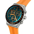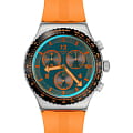 Часы Swatch YVS529 — это стильный и современный аксессуар для тех, кто ценит лёгкость и комфорт. Этот хронографХронографФункция позволяет измерять отрезки времени с особой точностью: часы, минуты, секунды. Верным признаком хронографа является наличие на циферблате 3 дополнительных окошек-счётчиков. из нержавеющей стали имеет синий циферблат с оранжевым принтом. Часовая и минутная стрелки серебристой расцветки, а также синяя секундная стрелка светятся в темноте из-за люминесцентного покрытияЛюминесцентное покрытиеПозволяет считывать показания времени в темноте. Производители наносят на стрелки, часовые индексы, безель или поверхность циферблата светонакопительный состав, дающий холодное свечение.. Часы заключены в матовый стальной корпус, оснащены стальным безелемБезельВнешний ободок, закрепляющий стекло. В спортивных часах так называется поворотное кольцо с делениями на циферблате, выполняет роль таймера – замеряет отрезки времени на шкале. Неподвижный безель – элемент декора. Однонаправленно вращающийся безель на дайверских часах позволяет фиксировать моменты погружения и выныривания на поверхность. с черным PVDPVDУльтратонкое покрытие наносится в технике вакуумного напыления, сочетает в себе нитрид титана особой прочности со слоем золота или оксида хрома. Несёт в себе декоративную или защитную функцию. покрытием и шкалой тахиметраТахиметрРазмеченная шкала, располагается на ободке или безеле часов. Тахиметр позволяет рассчитать скорость на определённом участке пути, расстояние измеряется в километрах или милях.. Модель дополнена броским оранжевым ремешком с тренчиками в тон и блестящей стальной полупряжкой. Водозащита 30 метров делает часы практичными для повседневного использования. Эти часы подойдут для повседневного ношения и станут ярким акцентом в вашем наряде.