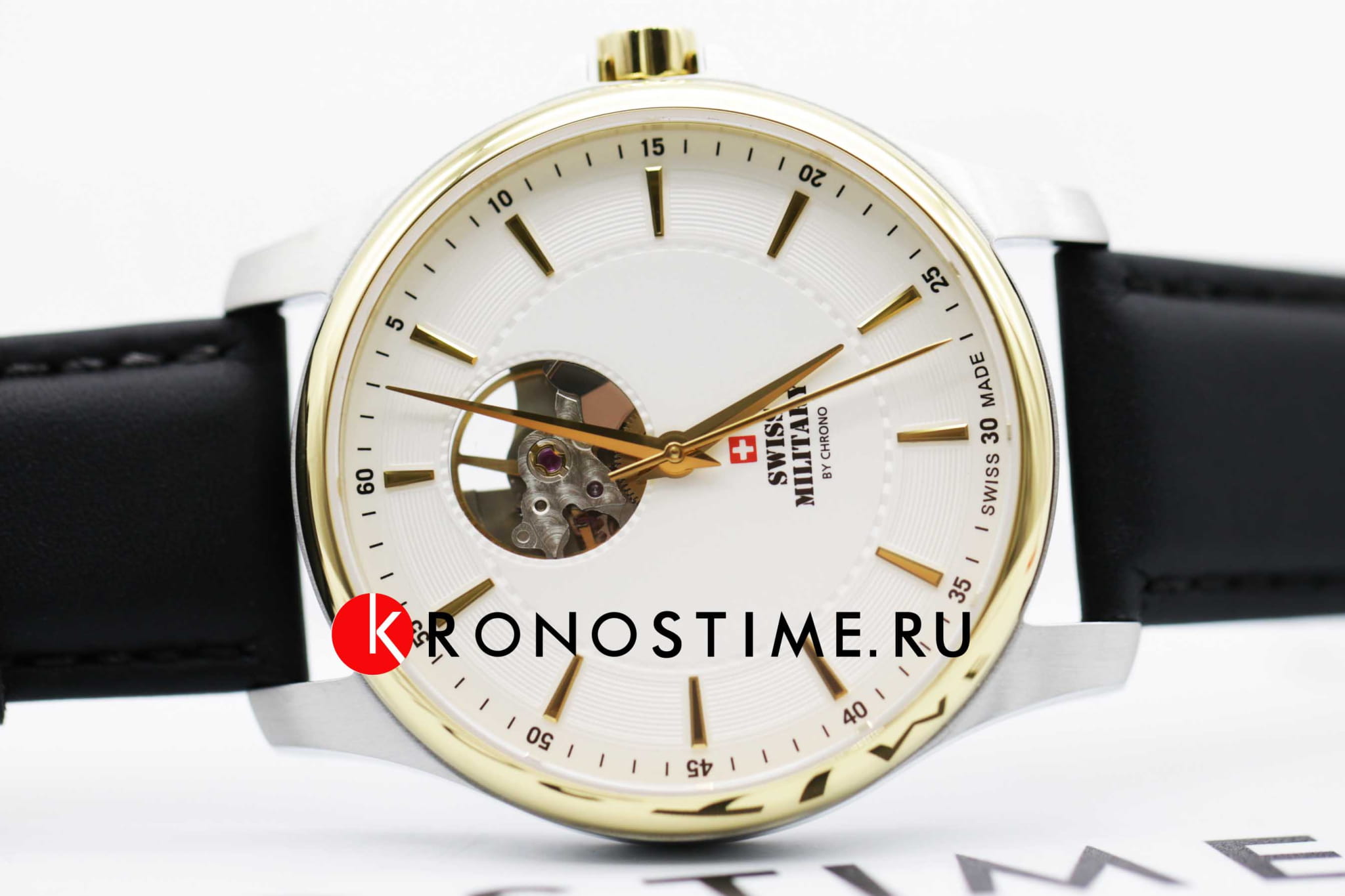 Мужские швейцарские наручные часы-скелетоны Swiss Military by Chrono SMA34050.07, механический механизм (автоматический калибр) с высокой точностью. Сапфировое стеклоСапфировое стеклоПрочный и надёжный материал из кристалла сапфира синтетического происхождения, характеризующийся особой твёрдостью и устойчивостью к царапинам и повреждениям. устойчивое к появлению царапин, обладающее высокой прозрачностью. Класс водозащиты: 100 метров, позволит плавать, нырять и заниматься другими водными видами спорта. Корпус часов изготовлен из стали IP-покрытиемIP-покрытиеМетод ионного напыления. Демонстрирует повышенную устойчивость к истиранию, окислению и химическим веществам. Под воздействием высокого давления и температуры около 1500°C молекулы металла надёжно соединяются с частицами корпуса часов. цвета желтое золото. Калибр Sellita SW-200. Сквозь прозрачное окошко на циферблате можно наблюдать за работой механизма часов. Заводная головка с защитой. Черный кожаный браслет на стандартной застежке.