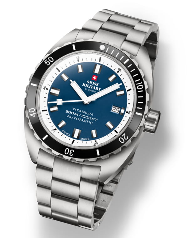 Мужские швейцарские механические часы с автоподзаводом Swiss Military by Chrono Titanium 300 SMA34100.03. Сапфировое стеклоСапфировое стеклоПрочный и надёжный материал из кристалла сапфира синтетического происхождения, характеризующийся особой твёрдостью и устойчивостью к царапинам и повреждениям. устойчивое к появлению царапин, обладающее высокой прозрачностью. Корпус часов изготовлен из титана. Вращающийся безельБезельВнешний ободок, закрепляющий стекло. В спортивных часах так называется поворотное кольцо с делениями на циферблате, выполняет роль таймера – замеряет отрезки времени на шкале. Неподвижный безель – элемент декора. Однонаправленно вращающийся безель на дайверских часах позволяет фиксировать моменты погружения и выныривания на поверхность. из высокотехнологичной керамикиВысокотехнологичная керамикаИнновационный запатентованный Rado материал с гладкой или матовой поверхностью. Керамика за счёт кристаллической структуры обладает повышенной устойчивостью от возникновения царапин. Материал способен принимать температуру тела человека, обеспечивая невероятный комфорт при ношении.. Индикация даты на позиции трех часов. Стрелки и метки с люминесцентной подсветкойЛюминесцентное покрытиеПозволяет считывать показания времени в темноте. Производители наносят на стрелки, часовые индексы, безель или поверхность циферблата светонакопительный состав, дающий холодное свечение.. Класс водозащиты: 300 метров, позволит плавать, нырять и заниматься другими водными видами спорта. Титановый браслет на раскладной застёжкеРаскладная застёжкаТакой тип застёжки используется только на браслетах из металла. Она никогда не раскрывается полностью, происходит разделение на 2 и более частей. Раскладывающая застёжка снизит вероятность потери часов к минимуму..