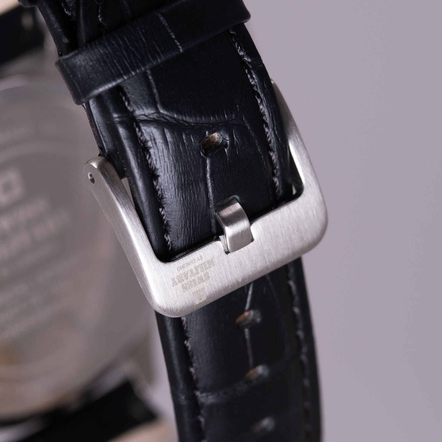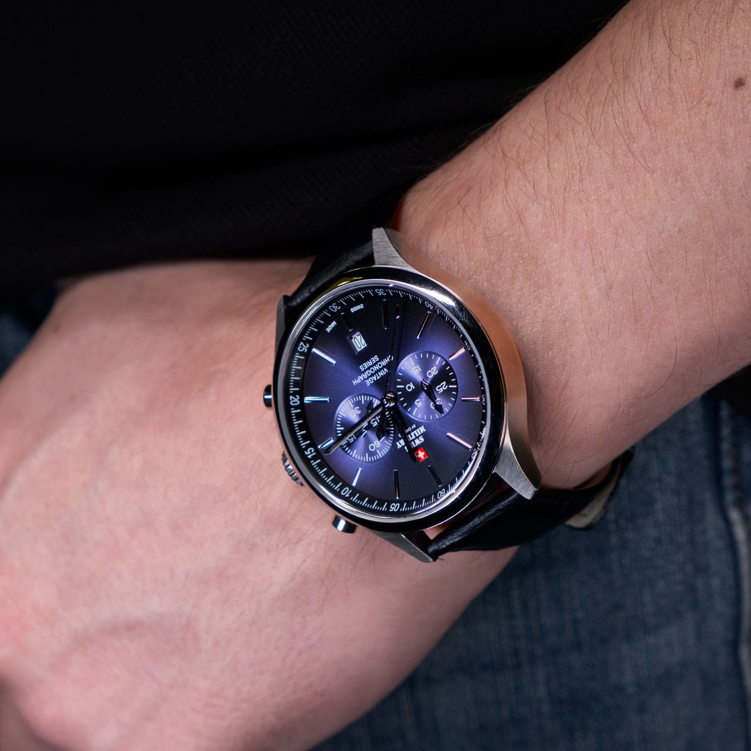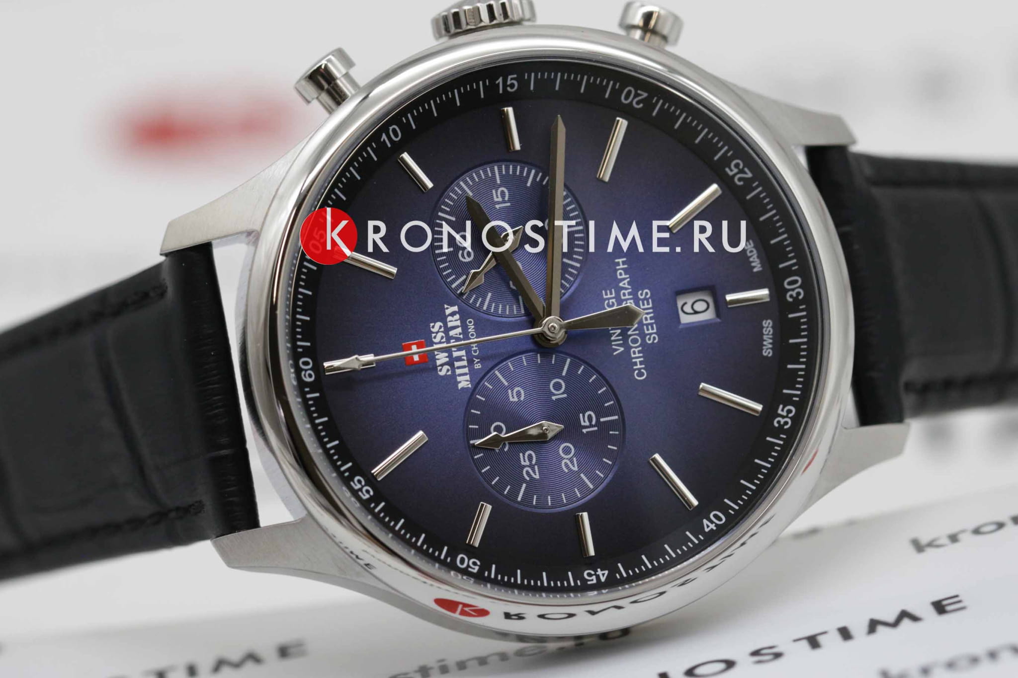 Мужские швейцарские наручные часы-хронографХронографФункция позволяет измерять отрезки времени с особой точностью: часы, минуты, секунды. Верным признаком хронографа является наличие на циферблате 3 дополнительных окошек-счётчиков. Swiss Military by Chrono SM30192.08, кварцевый механизм с высокой точностью. Класс водозащиты: 100 метров, позволит плавать, нырять и заниматься другими водными видами спорта. Корпус часов изготовлен из стали серебристого цвета. Апертура даты в позиции 6 часов. Черный кожаный ремешок с классической пряжкой. Модель оснащена секундомеромСекундомерСекундоме́р — прибор, способный измерять интервалы времени с точностью до долей секунды.. Стрелки и метки с люминесцентной подсветкойЛюминесцентное покрытиеПозволяет считывать показания времени в темноте. Производители наносят на стрелки, часовые индексы, безель или поверхность циферблата светонакопительный состав, дающий холодное свечение..