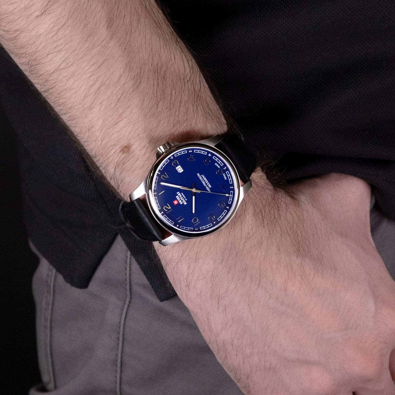 Часы Swiss Military SM30200.26 — это изысканный аксессуар, который гармонично сочетает классический дизайн и швейцарское мастерство. Корпус из нержавеющей стали диаметром 39 мм отличается элегантным видом и прочностью. Надёжное сапфировое стеклоСапфировое стеклоПрочный и надёжный материал из кристалла сапфира синтетического происхождения, характеризующийся особой твёрдостью и устойчивостью к царапинам и повреждениям. защищает синий циферблат от повреждений, обеспечивая его безупречный вид даже при длительном использовании.