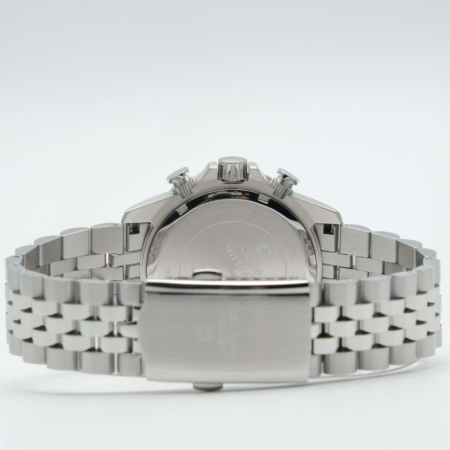 Часы Swiss Military by Chrono Sports Chronograph SM34103.06 — это спортивный хронограф, сочетающий стиль и функциональность. Корпус диаметром 43 мм выполнен из нержавеющей стали, что обеспечивает долговечность и надёжность. Циферблат украшен люминесцентными индексамиЛюминесцентное покрытиеПозволяет считывать показания времени в темноте. Производители наносят на стрелки, часовые индексы, безель или поверхность циферблата светонакопительный состав, дающий холодное свечение. и стрелками, что позволяет легко считывать время в любых условиях. Защиту циферблата обеспечивает сапфировое стеклоСапфировое стеклоПрочный и надёжный материал из кристалла сапфира синтетического происхождения, характеризующийся особой твёрдостью и устойчивостью к царапинам и повреждениям., устойчивое к царапинам. Модель оснащена вращающимся безелемБезельВнешний ободок, закрепляющий стекло. В спортивных часах так называется поворотное кольцо с делениями на циферблате, выполняет роль таймера – замеряет отрезки времени на шкале. Неподвижный безель – элемент декора. Однонаправленно вращающийся безель на дайверских часах позволяет фиксировать моменты погружения и выныривания на поверхность. с PVD-покрытиемPVDУльтратонкое покрытие наносится в технике вакуумного напыления, сочетает в себе нитрид титана особой прочности со слоем золота или оксида хрома. Несёт в себе декоративную или защитную функцию., что добавляет дополнительную функциональность. Водозащита до 10 ATM делает часы подходящими для плавания и других водных активностей. Швейцарский кварцевый механизм Ronda 5040.D обеспечивает высокую точность измерения времени и функции хронографаХронографФункция позволяет измерять отрезки времени с особой точностью: часы, минуты, секунды. Верным признаком хронографа является наличие на циферблате 3 дополнительных окошек-счётчиков.. Апертура даты в позиции 4 часов. Браслет из нержавеющей стали c раскладной застёжкойРаскладная застёжкаТакой тип застёжки используется только на браслетах из металла. Она никогда не раскрывается полностью, происходит разделение на 2 и более частей. Раскладывающая застёжка снизит вероятность потери часов к минимуму. гарантирует комфортное ношение и надёжную фиксацию. Swiss Military — это идеальный выбор для мужчин, которые ценят швейцарское качество и ведут активный образ жизни.