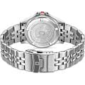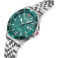 Мужские кварцевые часы Swiss Military Hanowa — швейцарская надёжность в классическом исполнении. Корпус круглый, из нержавеющей стали, диаметром 42 мм. Циферблат — зелёный с серебристыми стрелками. Стекло — сапфировоеСапфировое стеклоПрочный и надёжный материал из кристалла сапфира синтетического происхождения, характеризующийся особой твёрдостью и устойчивостью к царапинам и повреждениям.. Механизм — швейцарский кварцевый Ronda 505 с функцией (остановка секундной стрелки для точной настройки). БезельБезельВнешний ободок, закрепляющий стекло. В спортивных часах так называется поворотное кольцо с делениями на циферблате, выполняет роль таймера – замеряет отрезки времени на шкале. Неподвижный безель – элемент декора. Однонаправленно вращающийся безель на дайверских часах позволяет фиксировать моменты погружения и выныривания на поверхность. — неподвижный, из нержавеющей стали с IP-покрытиемIP-покрытиеМетод ионного напыления. Демонстрирует повышенную устойчивость к истиранию, окислению и химическим веществам. Под воздействием высокого давления и температуры около 1500°C молекулы металла надёжно соединяются с частицами корпуса часов.. Задняя крышка — завинчивающаяся. Водонепроницаемость 100 м. Браслет — стальной, на раскладной застёжке с кнопками и фиксаторомРаскладная застёжкаТакой тип застёжки используется только на браслетах из металла. Она никогда не раскрывается полностью, происходит разделение на 2 и более частей. Раскладывающая застёжка снизит вероятность потери часов к минимуму.. Идеальный выбор для тех, кто ценит швейцарское качество и классический стиль.