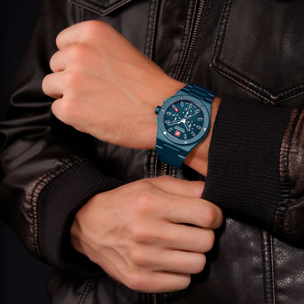 Мужские швейцарские часы-хронографХронографФункция позволяет измерять отрезки времени с особой точностью: часы, минуты, секунды. Верным признаком хронографа является наличие на циферблате 3 дополнительных окошек-счётчиков. Swiss Military Hanowa Thunderbolt Chrono SMWGI0002281, кварцевый механизм с высокой точностью. Сапфировое стеклоСапфировое стеклоПрочный и надёжный материал из кристалла сапфира синтетического происхождения, характеризующийся особой твёрдостью и устойчивостью к царапинам и повреждениям. устойчивое к появлению царапин, обладающее высокой прозрачностью. Класс водозащиты: 100 метров, позволит плавать, нырять и заниматься другими водными видами спорта. Корпус часов изготовлен из керамики. Керамический браслет с застежкой бабочкаЗастёжка "бабочка"Такой вид застёжки дополняется предохранителями, помогающими избежать случайного раскрытия браслета. Обладают изящным исполнением.