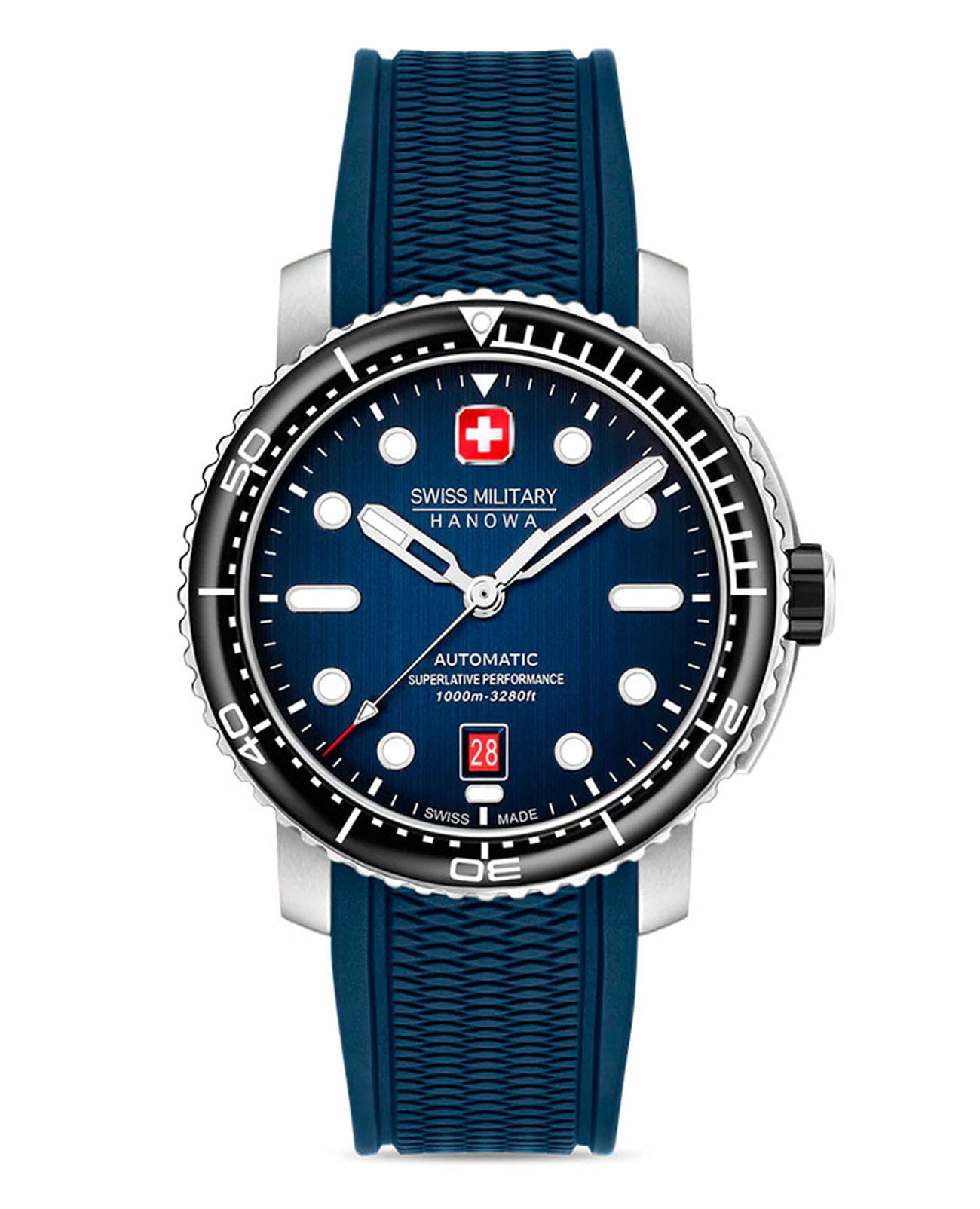 Swiss Military Hanowa Maitre Plongeur Automatic SMWGL0002002 — профессиональные часы для дайвинга с швейцарской точностью и надёжной конструкцией. Корпус диаметром 44 мм выполнен из нержавеющей стали, что обеспечивает прочность и долговечность. Однонаправленный вращающийся безельБезельВнешний ободок, закрепляющий стекло. В спортивных часах так называется поворотное кольцо с делениями на циферблате, выполняет роль таймера – замеряет отрезки времени на шкале. Неподвижный безель – элемент декора. Однонаправленно вращающийся безель на дайверских часах позволяет фиксировать моменты погружения и выныривания на поверхность. с керамической вставкой позволяет точно отслеживать время погружения. Синий циферблат украшен накладными часовыми индексами и стрелками с люминесцентным покрытиемЛюминесцентное покрытиеПозволяет считывать показания времени в темноте. Производители наносят на стрелки, часовые индексы, безель или поверхность циферблата светонакопительный состав, дающий холодное свечение., что гарантирует превосходную читаемость даже в темноте. Окошко даты расположено на отметке «6 часов». Защиту циферблата обеспечивает сапфировое стеклоСапфировое стеклоПрочный и надёжный материал из кристалла сапфира синтетического происхождения, характеризующийся особой твёрдостью и устойчивостью к царапинам и повреждениям., устойчивое к царапинам. Внутри установлен швейцарский автоматический механизм Soprod P024 с запасом хода до 38 часов, обеспечивающий надёжность и точность хода. Часы укомплектованы браслетом из нержавеющей стали, а раскладная застёжкаРаскладная застёжкаТакой тип застёжки используется только на браслетах из металла. Она никогда не раскрывается полностью, происходит разделение на 2 и более частей. Раскладывающая застёжка снизит вероятность потери часов к минимуму. гарантирует комфортную и надёжную фиксацию на запястье. В комплекте также предусмотрен сменный силиконовый ремешок. Водонепроницаемость 1000 метров делает модель идеальным выбором для глубоководного дайвинга. Автоматический гелиевый клапан обеспечивает безопасное выравнивание давления при всплытии.