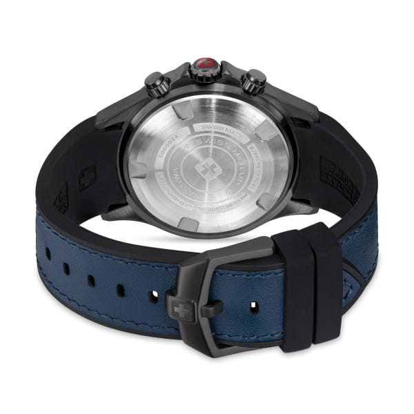 Мужские швейцарские часы-хронографХронографФункция позволяет измерять отрезки времени с особой точностью: часы, минуты, секунды. Верным признаком хронографа является наличие на циферблате 3 дополнительных окошек-счётчиков. Swiss Military Hanowa SMWGO0000902, кварцевый механизм с высокой точностью. ТахиметрТахиметрРазмеченная шкала, располагается на ободке или безеле часов. Тахиметр позволяет рассчитать скорость на определённом участке пути, расстояние измеряется в километрах или милях.. Сапфировое стеклоСапфировое стеклоПрочный и надёжный материал из кристалла сапфира синтетического происхождения, характеризующийся особой твёрдостью и устойчивостью к царапинам и повреждениям. устойчивое к появлению царапин, обладающее высокой прозрачностью. Корпус часов изготовлен из нержавеющей стали с IP-покрытиемIP-покрытиеМетод ионного напыления. Демонстрирует повышенную устойчивость к истиранию, окислению и химическим веществам. Под воздействием высокого давления и температуры около 1500°C молекулы металла надёжно соединяются с частицами корпуса часов.. Стрелки с люминесцентным покрытиемЛюминесцентное покрытиеПозволяет считывать показания времени в темноте. Производители наносят на стрелки, часовые индексы, безель или поверхность циферблата светонакопительный состав, дающий холодное свечение.. Окошко даты в положении 3 часа. Класс водозащиты: 100 метров, позволит плавать, нырять и заниматься другими водными видами спорта. Каучуковый ремешок на стандартной застежке.