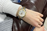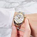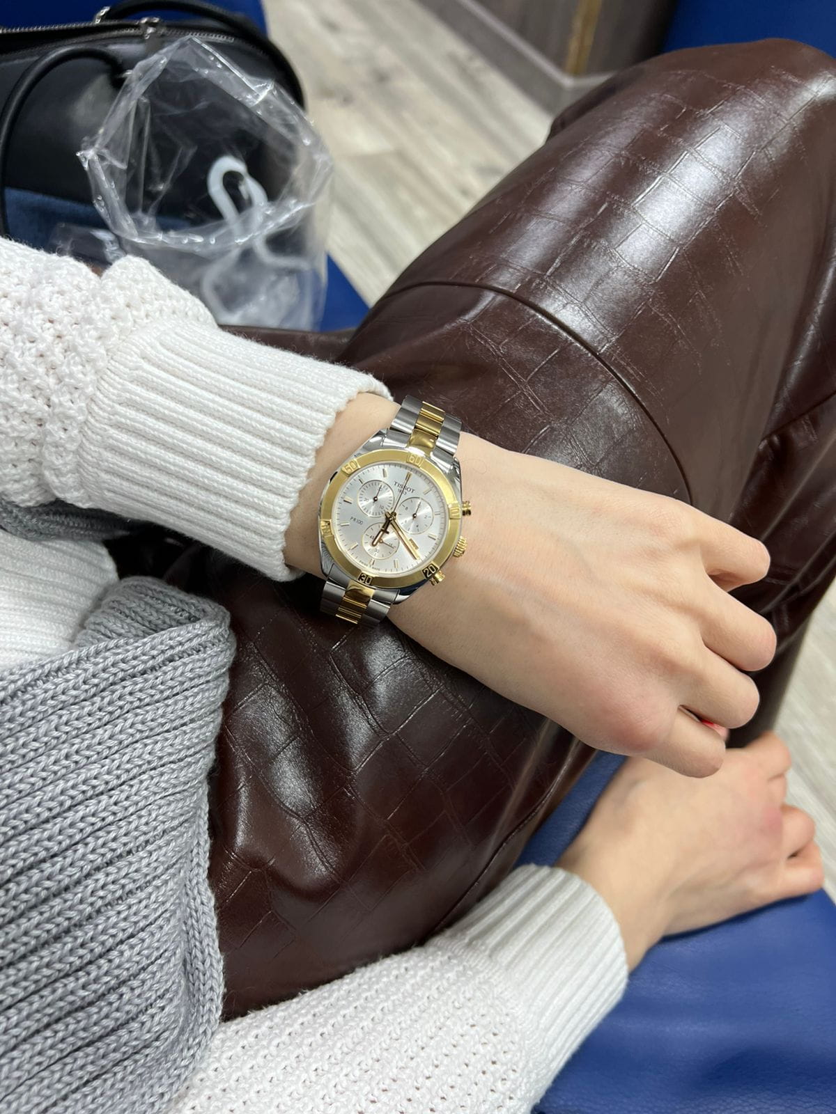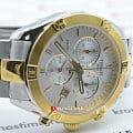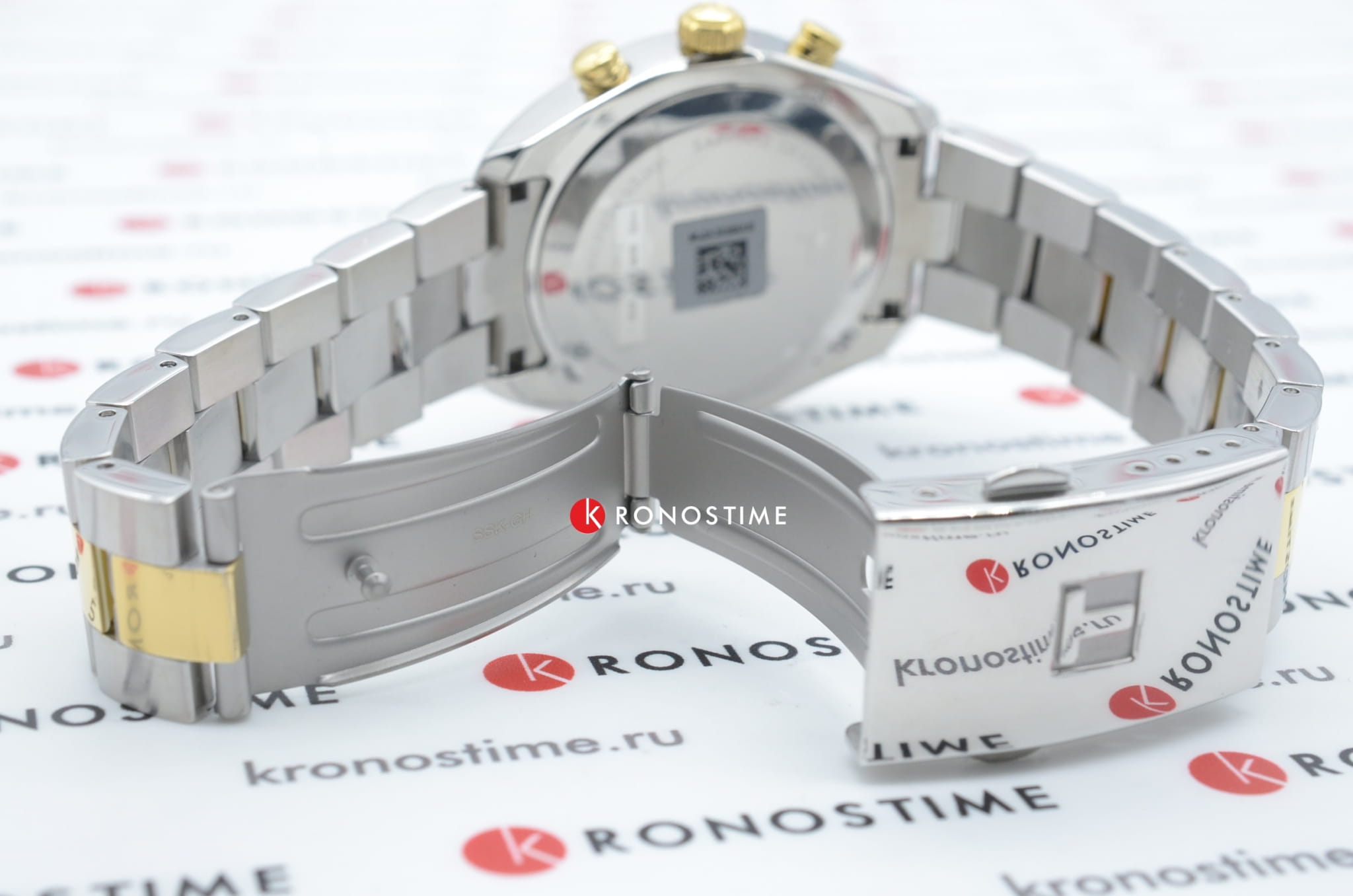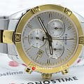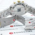 Модель привлекает оригинальным внешним видом, дизайнеры умело сочетают серебристый и золотистый оттенок. Классический стиль со спортивными деталями позволяет использовать часы в качестве дополнения к любому образу. Минималистичный циферблат. Кварцевый калибр ETA G15.212 с высокой точностью хода. Водонепроницаемость до 10 бар. Функционал: хронограф, секундомер, календарь. Габариты: 38 x 38 x 10,5 мм.