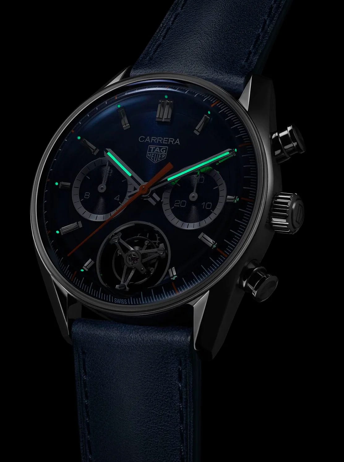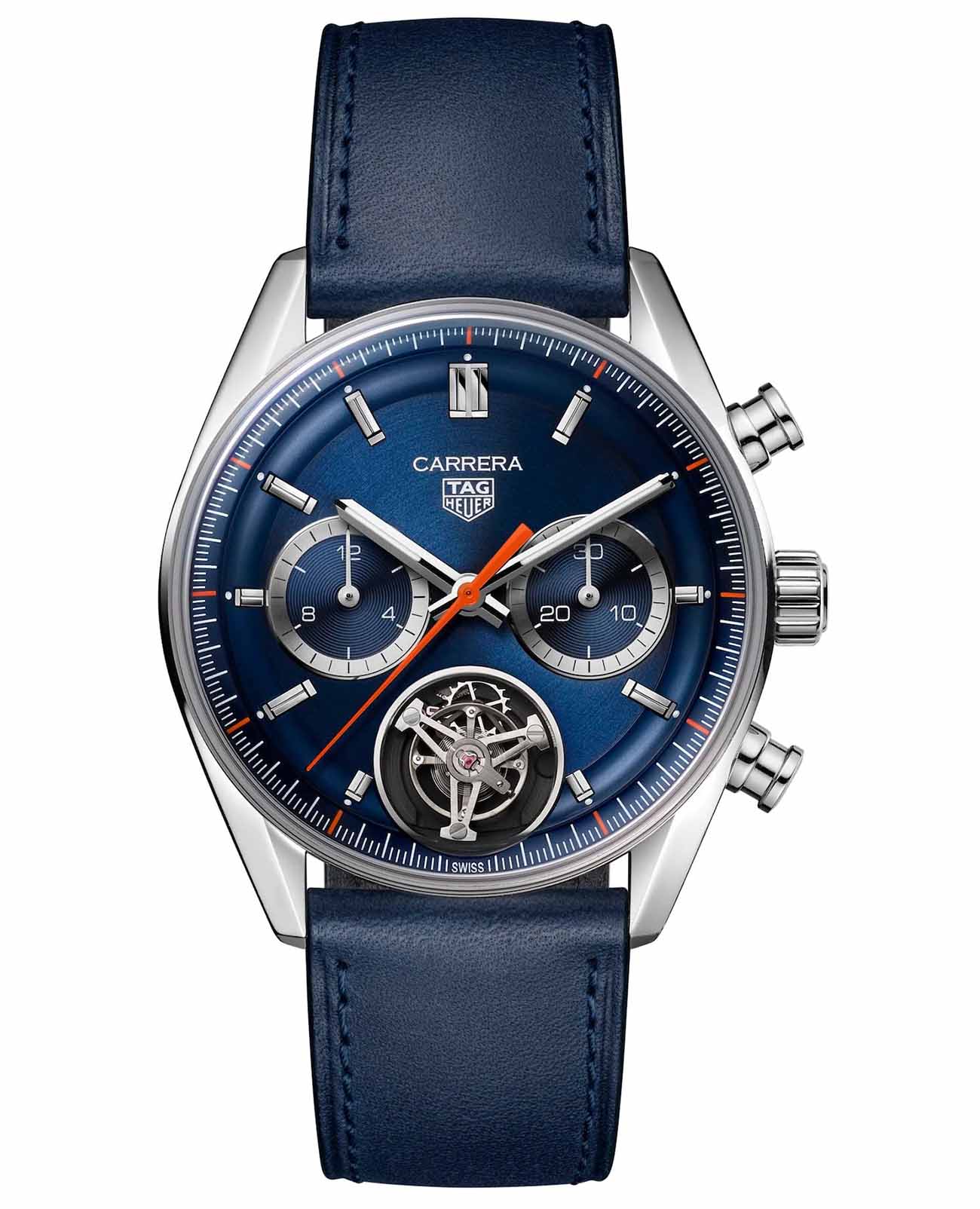 Часам TAG Heuer Carrera Chronograph Tourbillon CBS5010.FC6543 60 лет, а острые ощущения продолжаются. В честь 60-летия Carrera эта синяя версия нового TAG Heuer Carrera уверенно завоевывает статус абсолютной иконы. Эти классические гоночные часы, оснащенные синими счетчиками "azurage" с технологией Super-LumiNova® и эффектным механизмом Heuer 02 с турбийоном в положении "6 часов", решительно не поддаются остановке. Часы-хронографХронографФункция позволяет измерять отрезки времени с особой точностью: часы, минуты, секунды. Верным признаком хронографа является наличие на циферблате 3 дополнительных окошек-счётчиков.. Механический механизм (автоматический калибр) с высокой точностью. Класс водозащиты: 100 метров, позволит плавать, нырять и заниматься другими водными видами спорта. Сапфировое стеклоСапфировое стеклоПрочный и надёжный материал из кристалла сапфира синтетического происхождения, характеризующийся особой твёрдостью и устойчивостью к царапинам и повреждениям. устойчивое к появлению царапин, обладающее высокой прозрачностью. Стрелки с люминесцентным покрытиемЛюминесцентное покрытиеПозволяет считывать показания времени в темноте. Производители наносят на стрелки, часовые индексы, безель или поверхность циферблата светонакопительный состав, дающий холодное свечение.. Корпус часов изготовлен из нержавеющей стали. Кожаный ремешок с раскладной застёжкойРаскладная застёжкаТакой тип застёжки используется только на браслетах из металла. Она никогда не раскрывается полностью, происходит разделение на 2 и более частей. Раскладывающая застёжка снизит вероятность потери часов к минимуму..
