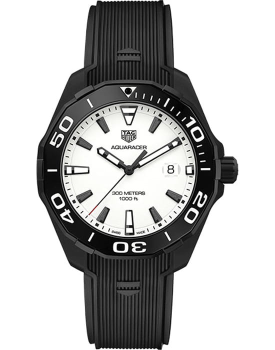 TAG Heuer Aquaracer WAY108A.FT6141 — элегантные мужские часы, сочетающие современный дизайн и высокую функциональность. Корпус диаметром 43 мм выполнен из титана с PVD-покрытиемPVDУльтратонкое покрытие наносится в технике вакуумного напыления, сочетает в себе нитрид титана особой прочности со слоем золота или оксида хрома. Несёт в себе декоративную или защитную функцию. чёрного цвета, обеспечивающим лёгкость и прочность. Белый циферблат с часовыми метками и стрелками, покрытыми люминесцентным покрытиемЛюминесцентное покрытиеПозволяет считывать показания времени в темноте. Производители наносят на стрелки, часовые индексы, безель или поверхность циферблата светонакопительный состав, дающий холодное свечение., гарантирует отличную читаемость в любых условиях освещения. Часы оснащены точным кварцевым механизмом, обеспечивающим стабильное отображение времени. Функциональность включает индикацию часов, минут, секунд и даты, расположенной на отметке «3 часа». Сапфировое стеклоСапфировое стеклоПрочный и надёжный материал из кристалла сапфира синтетического происхождения, характеризующийся особой твёрдостью и устойчивостью к царапинам и повреждениям. обеспечивает надёжную защиту от царапин и превосходную читаемость. Чёрный каучуковый ремешок оснащён раскладной застёжкойРаскладная застёжкаТакой тип застёжки используется только на браслетах из металла. Она никогда не раскрывается полностью, происходит разделение на 2 и более частей. Раскладывающая застёжка снизит вероятность потери часов к минимуму. из титана с PVD-покрытиемPVDУльтратонкое покрытие наносится в технике вакуумного напыления, сочетает в себе нитрид титана особой прочности со слоем золота или оксида хрома. Несёт в себе декоративную или защитную функцию. и двойными предохранительными кнопками. Водозащита до 300 метров (30 бар) делает модель идеальной для дайвинга и активного образа жизни.