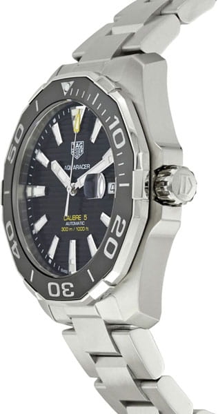 Автоматические мужские часы TAG Heuer Aquaracer Calibre 5 Automatic WAY201A.BA0927, механический механизм (автоматический калибр) с высокой точностью. Сапфировое стеклоСапфировое стеклоПрочный и надёжный материал из кристалла сапфира синтетического происхождения, характеризующийся особой твёрдостью и устойчивостью к царапинам и повреждениям. устойчивое к появлению царапин, обладающее высокой прозрачностью. Класс водозащиты: 300 метров, позволит плавать, нырять и заниматься другими водными видами спорта. Корпус часов изготовлен из стали. Стальной браслет на раскладной застёжкеРаскладная застёжкаТакой тип застёжки используется только на браслетах из металла. Она никогда не раскрывается полностью, происходит разделение на 2 и более частей. Раскладывающая застёжка снизит вероятность потери часов к минимуму.. В механизме 25 или 26 камней в зависимости от исполнения, частота 28800 полуколебаний в час. Запас хода 38 часов. Окошко даты с увеличительным стеклом. Керамический безельБезельВнешний ободок, закрепляющий стекло. В спортивных часах так называется поворотное кольцо с делениями на циферблате, выполняет роль таймера – замеряет отрезки времени на шкале. Неподвижный безель – элемент декора. Однонаправленно вращающийся безель на дайверских часах позволяет фиксировать моменты погружения и выныривания на поверхность. вращается в одном направлении. Завинчивающаяся заводная головка с защитой. Завинчивающаяся задняя крышка. Накладные полированные граненые индексы с родиевым покрытием. Стрелки и метки с люминесцентным покрытиемЛюминесцентное покрытиеПозволяет считывать показания времени в темноте. Производители наносят на стрелки, часовые индексы, безель или поверхность циферблата светонакопительный состав, дающий холодное свечение..