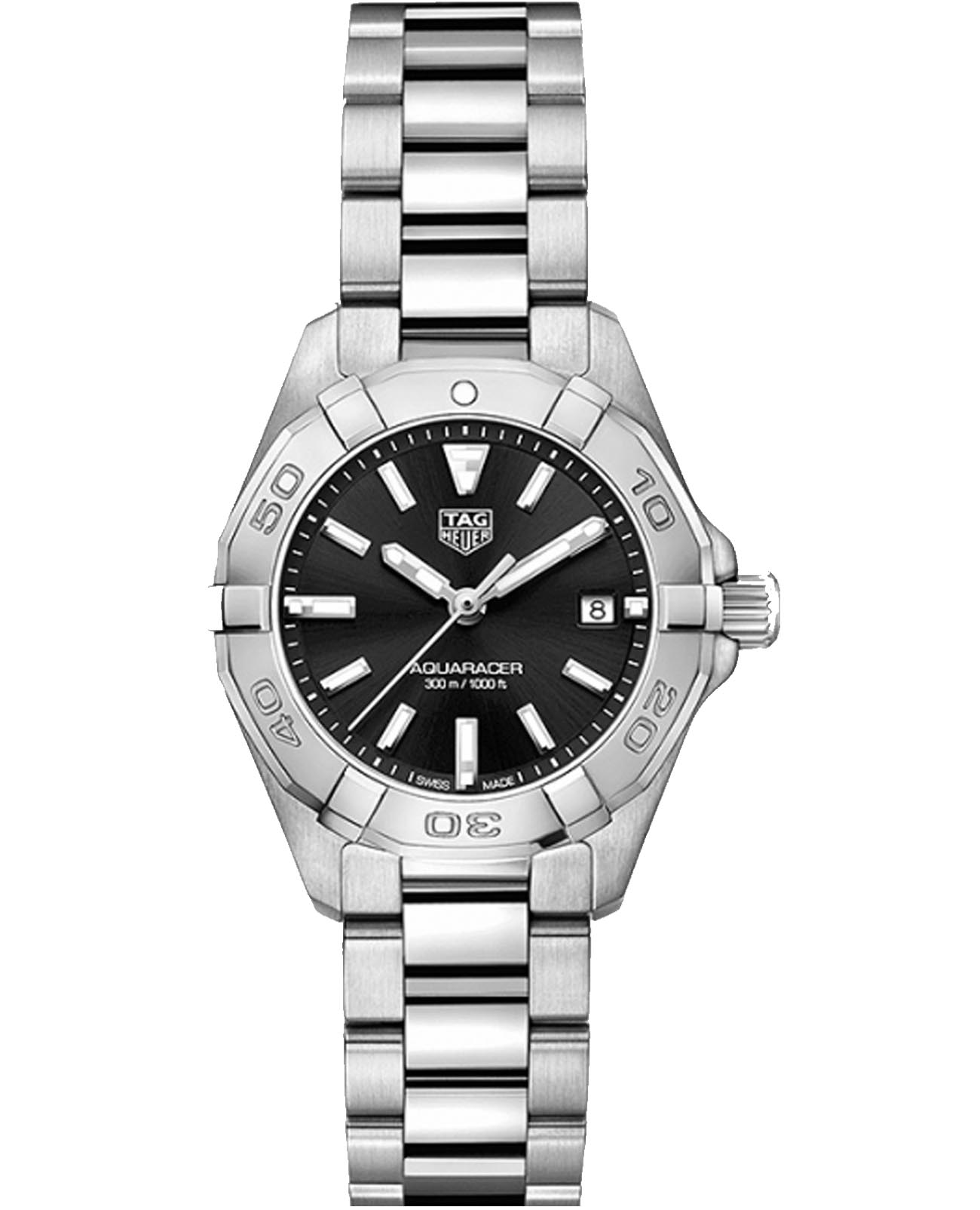 Изысканные кварцевые женские часы TAG Heuer Aquaracer WBD1410.BA0741 с большим, выразительным корпусом диаметром 27 мм из нержавеющей стали. Кварцевый механизм с высокой точностью. Сапфировое стеклоСапфировое стеклоПрочный и надёжный материал из кристалла сапфира синтетического происхождения, характеризующийся особой твёрдостью и устойчивостью к царапинам и повреждениям. устойчивое к появлению царапин, обладающее высокой прозрачностью. Класс водозащиты: 300 метров, позволит плавать, нырять и заниматься другими водными видами спорта. Корпус часов изготовлен из стали, серебристого цвета. Стрелки с люминесцентным покрытиемЛюминесцентное покрытиеПозволяет считывать показания времени в темноте. Производители наносят на стрелки, часовые индексы, безель или поверхность циферблата светонакопительный состав, дающий холодное свечение.. Стальной браслет на раскладной застёжкеРаскладная застёжкаТакой тип застёжки используется только на браслетах из металла. Она никогда не раскрывается полностью, происходит разделение на 2 и более частей. Раскладывающая застёжка снизит вероятность потери часов к минимуму..