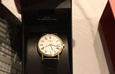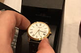 Отображение даты, корпус из стали с PVD-покрытием цвета желтого золота, кожаный ремешок.
