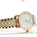 Тонкие и изящные наручные часы имеют оригинальный браслет, состоящий из переплетающихся между собой мельчайших звеньев. Модель имеет PVD-покрытиеPVDУльтратонкое покрытие наносится в технике вакуумного напыления, сочетает в себе нитрид титана особой прочности со слоем золота или оксида хрома. Несёт в себе декоративную или защитную функцию. оттенка "розовое золото", устойчивое к истиранию, белым оставлен только лаконичный циферблат. Кварцевый механизм ETA 902.101 с 4 камням. Надёжное и прочное сапфировое стекло. Водонепроницаемость 30 метров. Габариты: 30 x 30 x 6,2 мм.