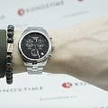 Часы швейцарского качества с чёрным циферблатом имеют три дополнительных окошка. Модель с хронографом и секундомером оснащена кварцевым механизмом ETA G10.211, который заключён в ударопрочный корпус из нержавеющей стали. Сапфировое стекло отличается устойчивостью к царапинам и прочим повреждениям. Раскладная застежка с кнопками. Габариты: 41 x 41 x 10,7 мм.