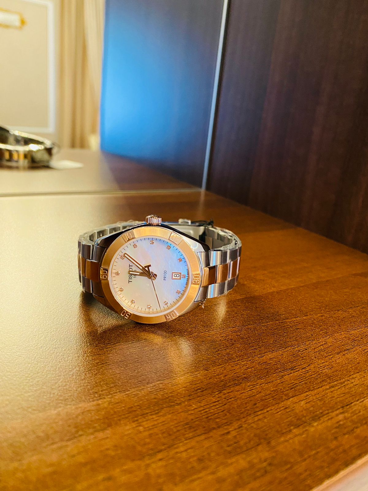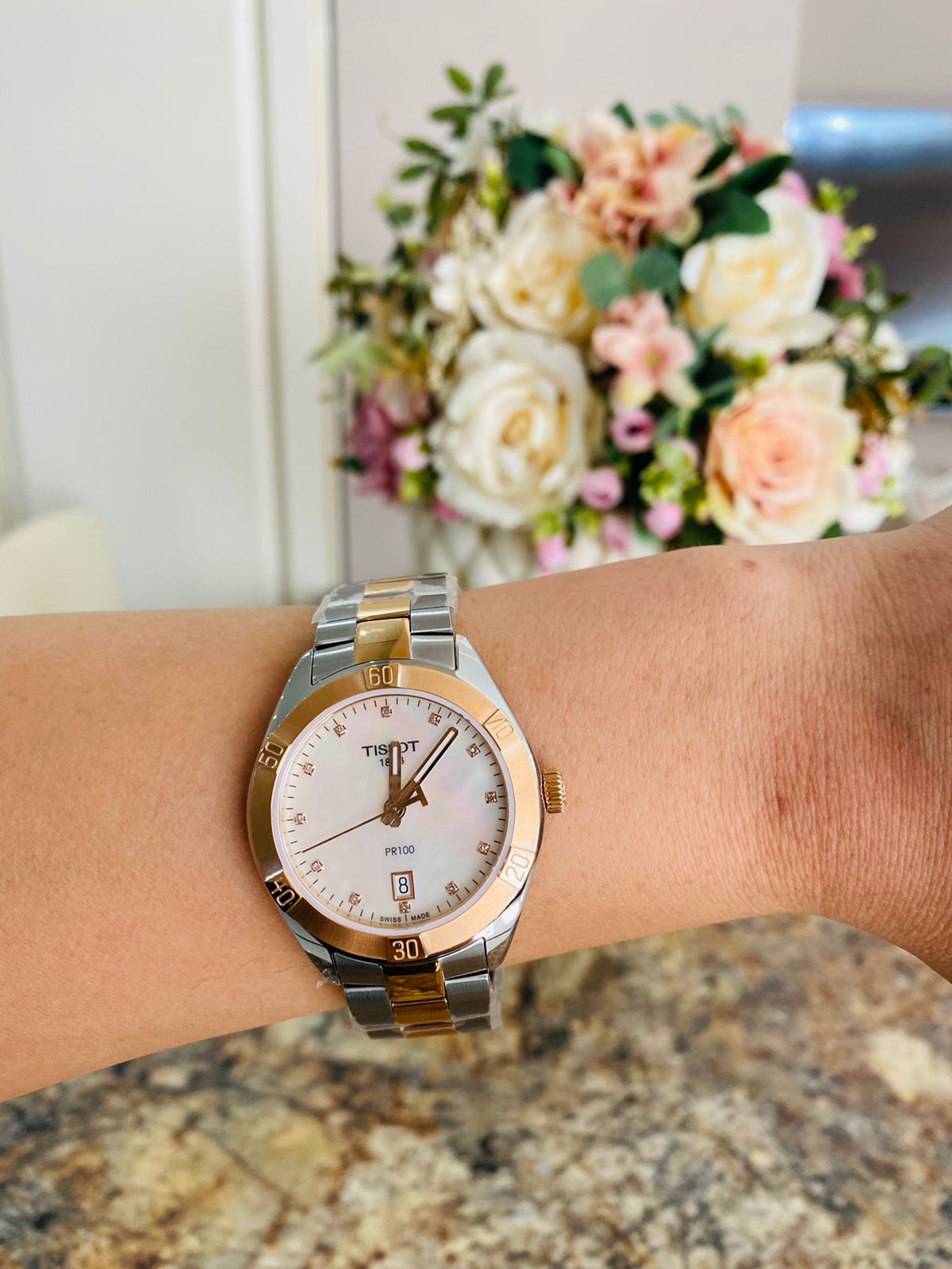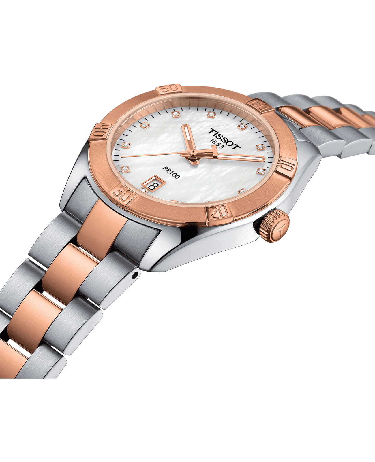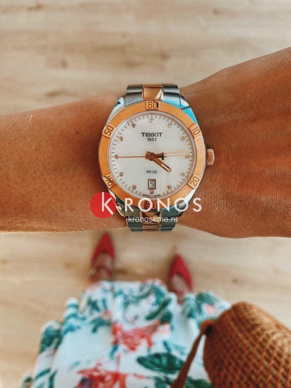 Женские наручные часы PR 100 Sport Chic были задуманы как повседневный аксессуар, но благодаря своему роскошному дизайну они прекрасно сочетаются и с вечерними нарядами. Циферблат украшен бриллиантами цвета Top Wesselton, добытыми без участия в конфликтах. Часы заключены в корпус из хирургической стали с золотистым PVD-покрытиемPVDУльтратонкое покрытие наносится в технике вакуумного напыления, сочетает в себе нитрид титана особой прочности со слоем золота или оксида хрома. Несёт в себе декоративную или защитную функцию., которое обеспечивает высокую износостойкость. В них установлен швейцарский кварцевый механизм ETA 955.412, защищённый с надёжным сапфировым стекломСапфировое стеклоПрочный и надёжный материал из кристалла сапфира синтетического происхождения, характеризующийся особой твёрдостью и устойчивостью к царапинам и повреждениям.. Водонепроницаемость до 100 метров, а среди функций есть индикация даты и система EOL. Размеры часов составляют 36 x 36 x 9 миллиметров. Производство и сборка осуществляются в Швейцарии.