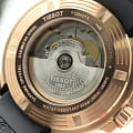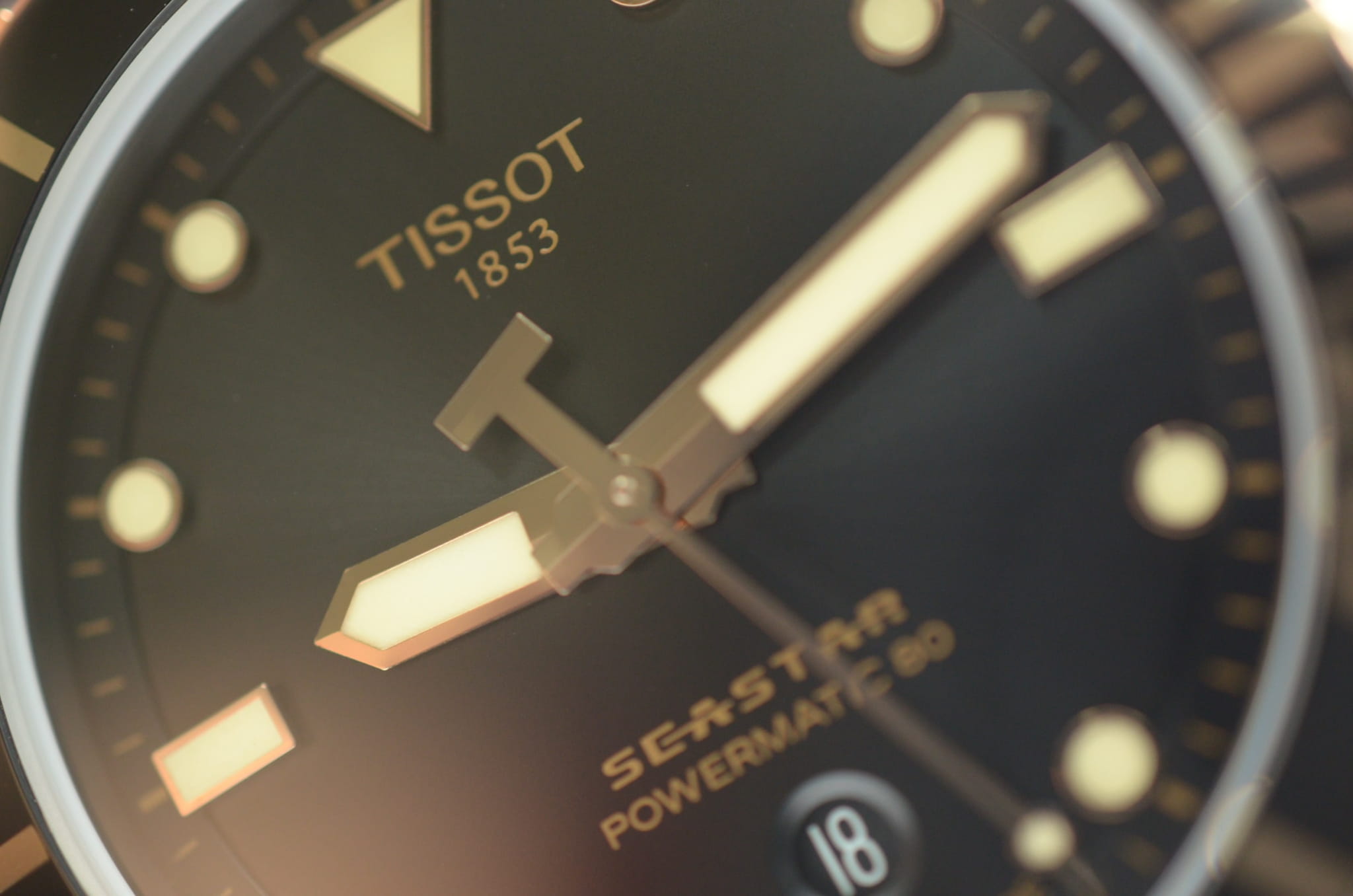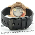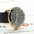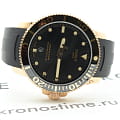Аксессуар характеризуется как дайверские часы, водонепроницаемость сохраняется при давлении до 30 бар на глубине 300 метров. Модель имеет чёрно-золотистое исполнение, последний оттенок был реализован благодаря PVD-покрытиюPVDУльтратонкое покрытие наносится в технике вакуумного напыления, сочетает в себе нитрид титана особой прочности со слоем золота или оксида хрома. Несёт в себе декоративную или защитную функцию.. Внутри герметичного корпуса с завинчивающейся заводной головкой находится популярный швейцарский калибр Powermatic 80Powermatic 80Эксклюзивный калибр от швейцарской компании ETA с увеличенным запасом хода до 80 часов за счёт удлинённой заводной пружины. Характеризуется улучшенной системой спуска со сниженным трением. с запасом хода до 80 часов. Прозрачная задняя крышка. Керамический безельБезельВнешний ободок, закрепляющий стекло. В спортивных часах так называется поворотное кольцо с делениями на циферблате, выполняет роль таймера – замеряет отрезки времени на шкале. Неподвижный безель – элемент декора. Однонаправленно вращающийся безель на дайверских часах позволяет фиксировать моменты погружения и выныривания на поверхность.. Гибкий каучуковый ремешок. Люминесцентная подсветкаЛюминесцентное покрытиеПозволяет считывать показания времени в темноте. Производители наносят на стрелки, часовые индексы, безель или поверхность циферблата светонакопительный состав, дающий холодное свечение.. Окошко даты. Габариты: 43 x 43 x 12,7 мм.