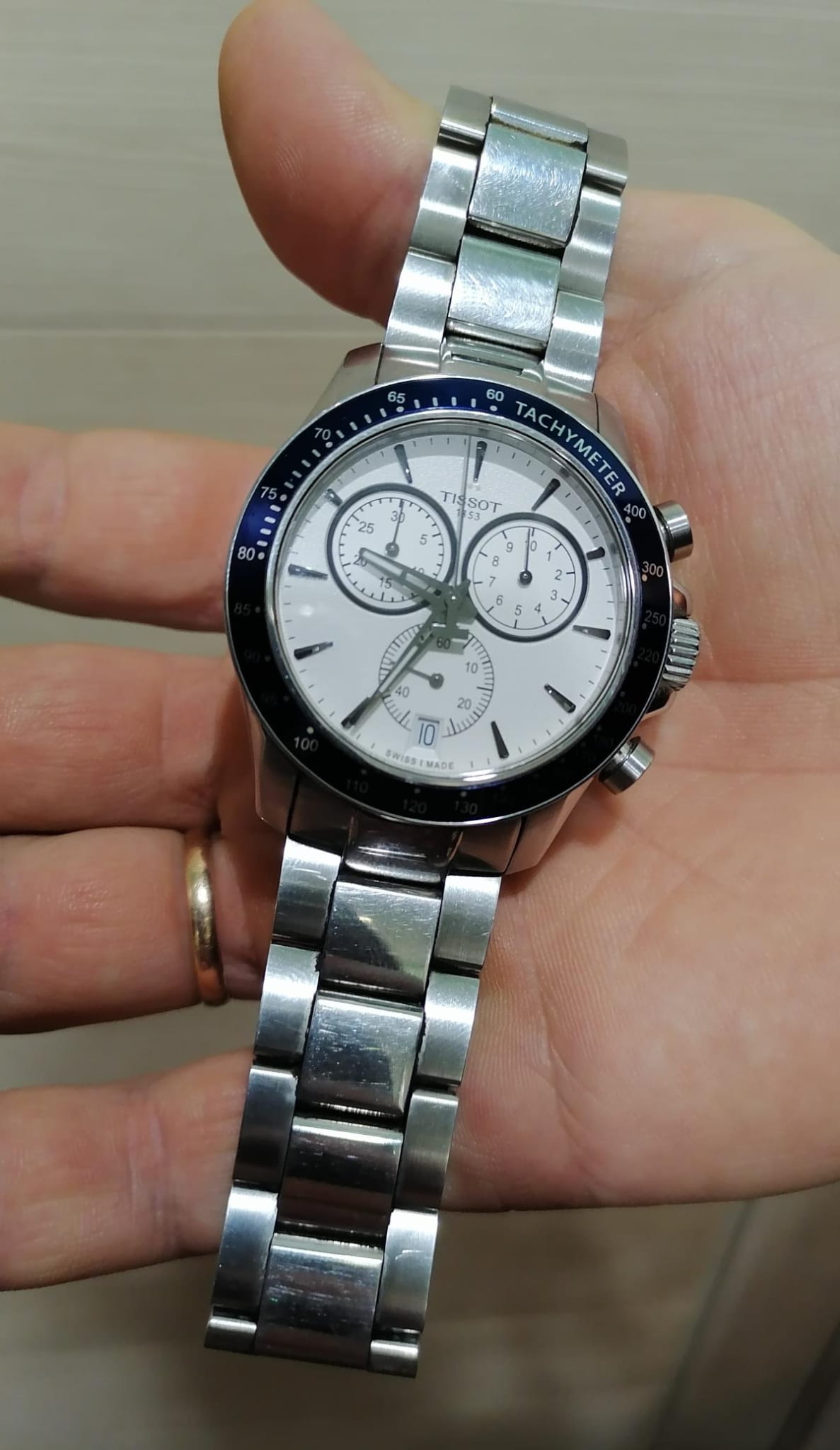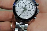 Спортивный высокоточный хронографХронографФункция позволяет измерять отрезки времени с особой точностью: часы, минуты, секунды. Верным признаком хронографа является наличие на циферблате 3 дополнительных окошек-счётчиков. в белом цвете дополнен броским синим безелемБезельВнешний ободок, закрепляющий стекло. В спортивных часах так называется поворотное кольцо с делениями на циферблате, выполняет роль таймера – замеряет отрезки времени на шкале. Неподвижный безель – элемент декора. Однонаправленно вращающийся безель на дайверских часах позволяет фиксировать моменты погружения и выныривания на поверхность. со шкалой , сочетание оттенков смотрится весьма гармонично. Работа часов осуществляется благодаря кварцевому калибру ETA G10.212 с высокой точностью хода. Стекло из сапфира устойчиво к образованию царапин. Браслет и корпус из долговечной стали 316L, противостоящей возникновению коррозии. . Секундомер, индикация числа. Габариты: 42,5 x 42,5 x 11,2 мм.