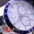 Спортивный высокоточный хронографХронографФункция позволяет измерять отрезки времени с особой точностью: часы, минуты, секунды. Верным признаком хронографа является наличие на циферблате 3 дополнительных окошек-счётчиков. в белом цвете дополнен броским синим безелемБезельВнешний ободок, закрепляющий стекло. В спортивных часах так называется поворотное кольцо с делениями на циферблате, выполняет роль таймера – замеряет отрезки времени на шкале. Неподвижный безель – элемент декора. Однонаправленно вращающийся безель на дайверских часах позволяет фиксировать моменты погружения и выныривания на поверхность. со шкалой , сочетание оттенков смотрится весьма гармонично. Работа часов осуществляется благодаря кварцевому калибру ETA G10.212 с высокой точностью хода. Стекло из сапфира устойчиво к образованию царапин. Браслет и корпус из долговечной стали 316L, противостоящей возникновению коррозии. . Секундомер, индикация числа. Габариты: 42,5 x 42,5 x 11,2 мм.