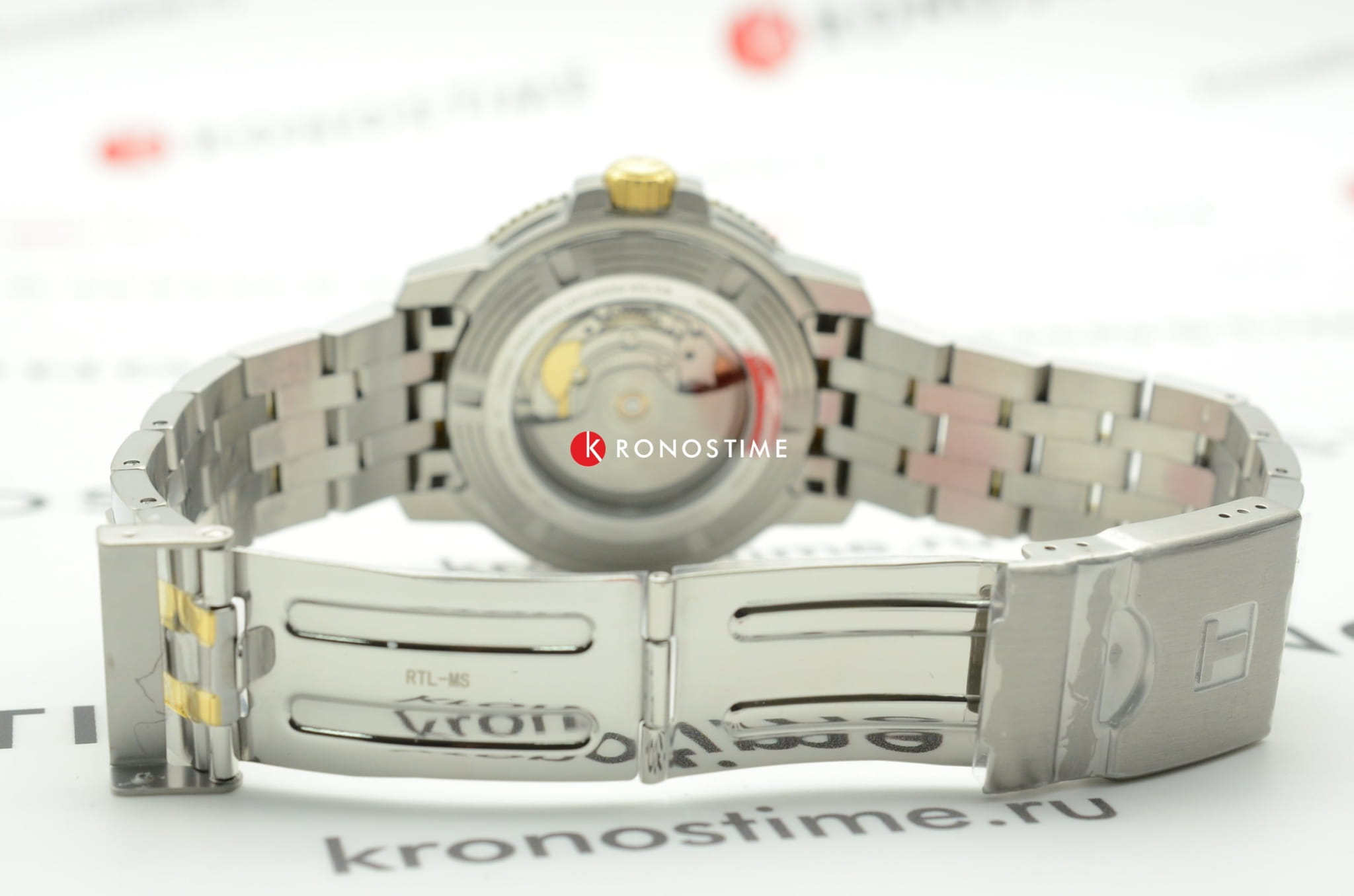 Роскошная модель с золотистым PVD-покрытиемPVDУльтратонкое покрытие наносится в технике вакуумного напыления, сочетает в себе нитрид титана особой прочности со слоем золота или оксида хрома. Несёт в себе декоративную или защитную функцию. станет неотъемлемой частью делового или повседневного образа, прекрасно подойдёт в качестве подарка. Дайверские часы сохраняют водостойкость при давлении 30 бар, они имеют завинчивающуюся заводную головку, кнопки и скелетонизированную заднюю крышку. Сквозь неё можно наблюдать за движением составных частей калибра Powermatic 80Powermatic 80Эксклюзивный калибр от швейцарской компании ETA с увеличенным запасом хода до 80 часов за счёт удлинённой заводной пружины. Характеризуется улучшенной системой спуска со сниженным трением. с увеличенным запасом хода 80 часов. Керамический безельБезельВнешний ободок, закрепляющий стекло. В спортивных часах так называется поворотное кольцо с делениями на циферблате, выполняет роль таймера – замеряет отрезки времени на шкале. Неподвижный безель – элемент декора. Однонаправленно вращающийся безель на дайверских часах позволяет фиксировать моменты погружения и выныривания на поверхность.. Сапфировое стекло. Застёжка с удлинением для дайверовУдлинение для дайверовЗастёжка с удлинением для дайверов представляет собой безопасное крепление, которое позволяет надевать часы поверх гидрокостюма. Гибкая застёжка удлиняется на 1-2 миллиметра.. Календарь. Габариты: 43 x 43 x 12,7 мм.