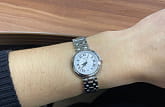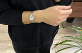 Дизайнеры реализуют свои идеи в оригинальном оформлении браслетов, центральные звенья цвета "розовое золото" приковывают взгляды. Интерес представляет также перламутровый циферблат компактного размера, благодаря этому часы красиво смотрятся на изящном женском запястье. Кварцевый механизм ETA F03.111. PVD-покрытие корпуса и браслета. Водонепроницаемость 100 метров. Габариты: 26 x 26 x 6,9 мм.