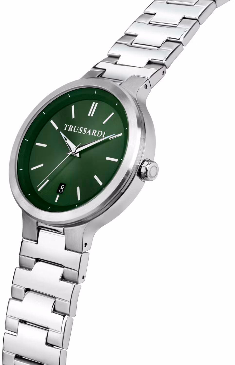 Итальянские мужские часы Trussardi Loud R2453164002 - это стильный мужской аксессуар, который сочетает элегантный дизайн и практичность. Корпус выполнен из нержавеющей стали, что обеспечивает долговечность и утончённый внешний вид. Надежное минеральное стеклоМинеральное стеклоМинеральное стекло представляет собой искусственно выращенный минерал кварца. Такое стекло отличается особой устойчивостью к повреждениям и царапинам. Уступает по некоторым качествам сапфировому стеклу. защищает циферблат от царапин и обеспечивает долговечность. Окошко даты в положении 6 часов. Стрелки оснащены люминесцентным покрытиемЛюминесцентное покрытиеПозволяет считывать показания времени в темноте. Производители наносят на стрелки, часовые индексы, безель или поверхность циферблата светонакопительный состав, дающий холодное свечение., обеспечивающим отличную видимость даже при слабом освещении. Модель оснащена кварцевым механизмом, обеспечивающим высокую точность хода. Браслет из нержавеющей стали с раскладной застёжкойРаскладная застёжкаТакой тип застёжки используется только на браслетах из металла. Она никогда не раскрывается полностью, происходит разделение на 2 и более частей. Раскладывающая застёжка снизит вероятность потери часов к минимуму. обеспечивает комфортное ношение. Водозащита 50 метров позволит защитить корпус от случайных брызг или капель дождя. Эта модель – отличный выбор для тех, кто ищет сочетание стиля, качества и функциональности. Часы станут не только полезным аксессуаром, но и выразительным элементом вашего имиджа.
