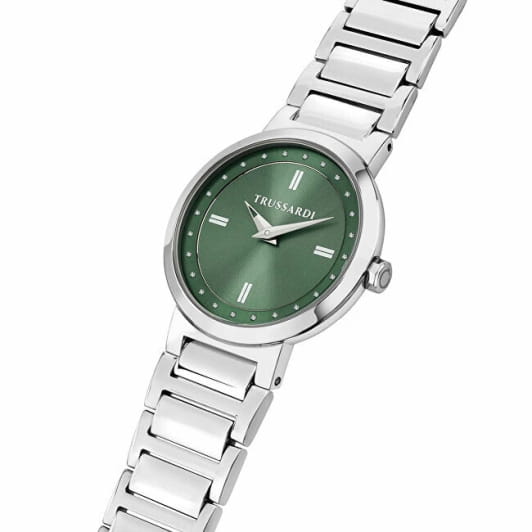 Итальянские женские часы Trussardi T-Bridge R2453171509 - это стильный женский аксессуар, который сочетает элегантный дизайн и практичность. Корпус выполнен из нержавеющей стали, что обеспечивает долговечность и утончённый внешний вид. Надежное минеральное стеклоМинеральное стеклоМинеральное стекло представляет собой искусственно выращенный минерал кварца. Такое стекло отличается особой устойчивостью к повреждениям и царапинам. Уступает по некоторым качествам сапфировому стеклу. защищает циферблат с кристаллами от царапин и обеспечивает долговечность. Модель оснащена кварцевым механизмом, обеспечивающим высокую точность хода. Браслет из нержавеющей стали на раскладной застёжкеРаскладная застёжкаТакой тип застёжки используется только на браслетах из металла. Она никогда не раскрывается полностью, происходит разделение на 2 и более частей. Раскладывающая застёжка снизит вероятность потери часов к минимуму. обеспечивает комфортное ношение. Водозащита 50 метров позволит защитить корпус от случайных брызг или капель дождя. Эта модель – отличный выбор для тех, кто ищет сочетание стиля, качества и функциональности. Часы станут не только полезным аксессуаром, но и выразительным элементом вашего имиджа.