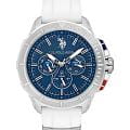 Мужские изысканные американские часы U.S. Polo Assn. Crossing USPA1066-01, кварцевый механизм с высокой точностью. Минеральное стеклоМинеральное стеклоМинеральное стекло представляет собой искусственно выращенный минерал кварца. Такое стекло отличается особой устойчивостью к повреждениям и царапинам. Уступает по некоторым качествам сапфировому стеклу. устойчивое к появлению царапин, обладающее высокой прозрачностью. Корпус изготовлен из нержавеющей стали с поворотным безелемБезельВнешний ободок, закрепляющий стекло. В спортивных часах так называется поворотное кольцо с делениями на циферблате, выполняет роль таймера – замеряет отрезки времени на шкале. Неподвижный безель – элемент декора. Однонаправленно вращающийся безель на дайверских часах позволяет фиксировать моменты погружения и выныривания на поверхность.. На стильном синем циферблате три дополнительных индикатора. Центральные часовая, минутная и секундная стрелки. Индикация даты и дня недели. 12/24х часовой формат времени. Класс водозащиты: 50 метров, позволит защитить корпус от случайных брызг или капель дождя. Силиконовый ремешок белого цвета со стандартной застежкой безупречно дополняет корпус. Стрелки оснащены люминесцентным покрытиемЛюминесцентное покрытиеПозволяет считывать показания времени в темноте. Производители наносят на стрелки, часовые индексы, безель или поверхность циферблата светонакопительный состав, дающий холодное свечение., обеспечивающим хорошую читаемость в темноте. Модель подчёркивает индивидуальность владельца и идеально подходит как для повседневного, так и для делового образа.