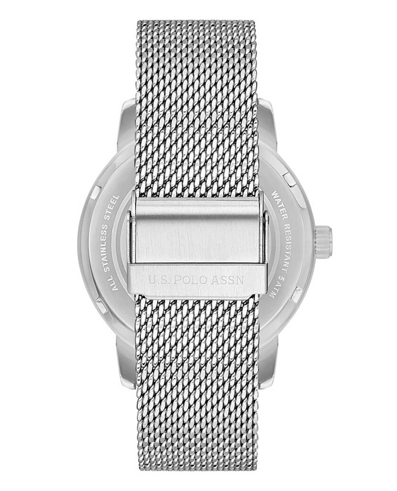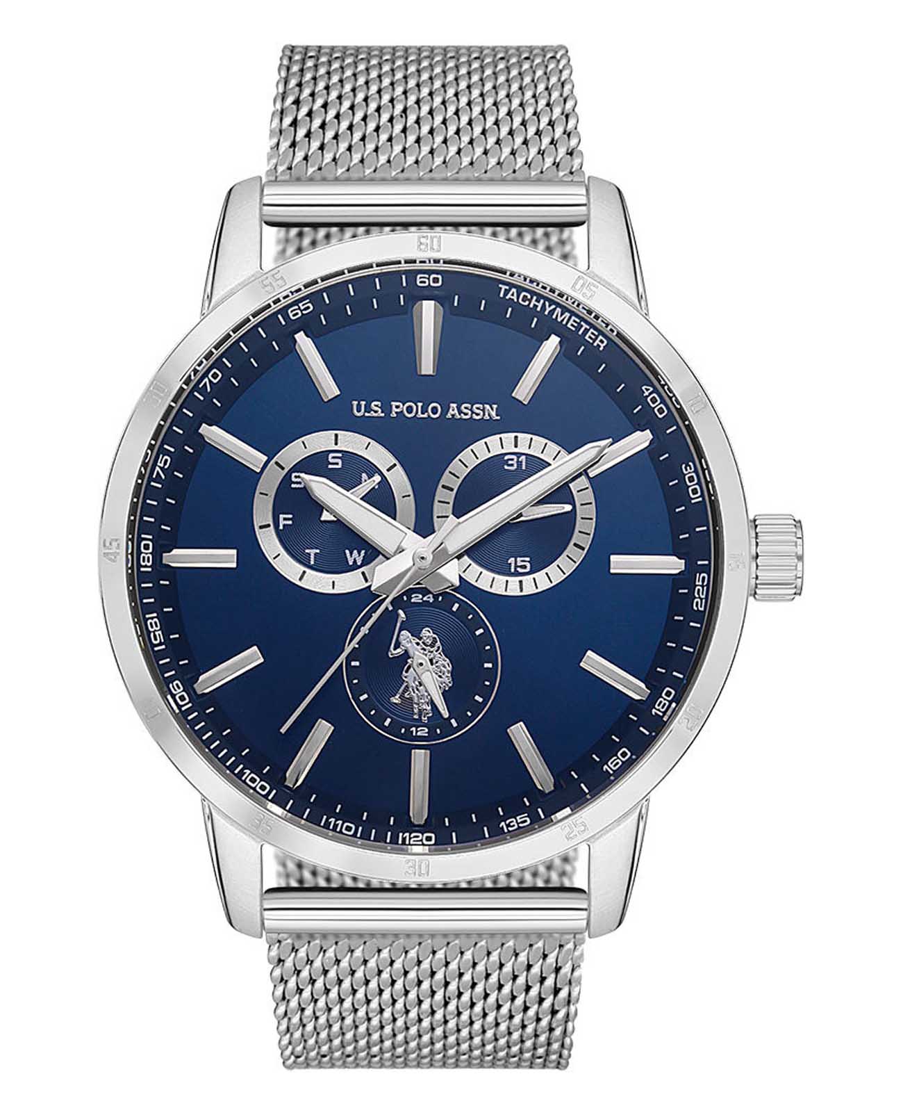 Мужские часы с тахиметромТахиметрРазмеченная шкала, располагается на ободке или безеле часов. Тахиметр позволяет рассчитать скорость на определённом участке пути, расстояние измеряется в километрах или милях. U.S. Polo Assn Fundamental USPA1075-02, кварцевый механизм с высокой точностью. Минеральное стеклоМинеральное стеклоМинеральное стекло представляет собой искусственно выращенный минерал кварца. Такое стекло отличается особой устойчивостью к повреждениям и царапинам. Уступает по некоторым качествам сапфировому стеклу. устойчивое к появлению царапин, обладающее высокой прозрачностью. Корпус изготовлен из нержавеющей стали. Центральные часовая, минутная и секундная стрелки. 24-х часовой формат времени, окошко даты и дня недели вынесены на отдельный циферблат. Стрелки с люминесцентным покрытиемЛюминесцентное покрытиеПозволяет считывать показания времени в темноте. Производители наносят на стрелки, часовые индексы, безель или поверхность циферблата светонакопительный состав, дающий холодное свечение.. Класс водозащиты: 50 метров, позволит защитить корпус от случайных брызг или капель дождя. Стальной браслет миланского плетения на раскладном замкеРаскладной замокДанный вариант застежки используется только на часах с металлическим браслетом. Отличительная особенность такого крепления в том, что длина браслета становится универсальной и вы можете самостоятельно отрегулировать нужный вам размер – застежка просто двигается по браслету часов..