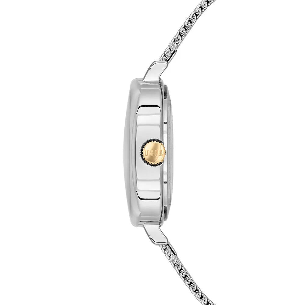 Женские часы U.S. Polo Assn. Stile USPA2087-04, кварцевый механизм с высокой точностью. Минеральное стеклоМинеральное стеклоМинеральное стекло представляет собой искусственно выращенный минерал кварца. Такое стекло отличается особой устойчивостью к повреждениям и царапинам. Уступает по некоторым качествам сапфировому стеклу. устойчивое к появлению царапин, обладающее высокой прозрачностью. Изысканный корпус изготовлен из нержавеющей стали. Лаконичные центральные часовая, минутная и секундная стрелки. Водонепроницаемость 3 АТМ позволяет использовать часы в повседневных условиях — при мытье рук или под лёгким дождём. Браслет выполнен в технике миланского плетения из стали и оснащён раскладным замкомРаскладная застёжкаТакой тип застёжки используется только на браслетах из металла. Она никогда не раскрывается полностью, происходит разделение на 2 и более частей. Раскладывающая застёжка снизит вероятность потери часов к минимуму., обеспечивающий комфорт и уверенную фиксацию на запястье, а также добавляя завершающий штрих к этому стильному аксессуару. Циферблат подчёркивает изысканный характер часов, создавая универсальный образ, подходящий как для повседневных ситуаций, так и для особых случаев.