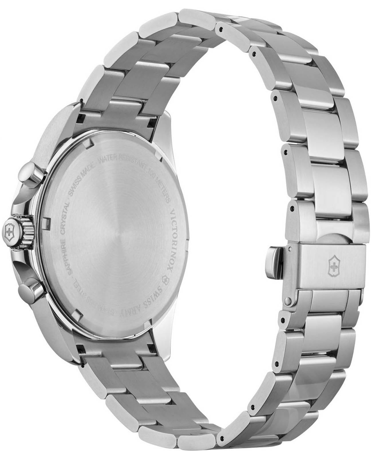 Мужские швейцарские часы-хронографХронографФункция позволяет измерять отрезки времени с особой точностью: часы, минуты, секунды. Верным признаком хронографа является наличие на циферблате 3 дополнительных окошек-счётчиков. Victorinox Fieldforce Chronograph 241857 с надёжным кварцевым механизмом. Сапфировое стеклоСапфировое стеклоПрочный и надёжный материал из кристалла сапфира синтетического происхождения, характеризующийся особой твёрдостью и устойчивостью к царапинам и повреждениям. с трёхслойным антибликовым покрытием. Корпус часов выполнен из нержавеющей стали 316L. Стальной браслет на раскладной застёжкеРаскладная застёжкаТакой тип застёжки используется только на браслетах из металла. Она никогда не раскрывается полностью, происходит разделение на 2 и более частей. Раскладывающая застёжка снизит вероятность потери часов к минимуму.. Влагозащита: 100 метров, позволит плавать, нырять и заниматься другими водными видами спорта. Окошко даты находится в положении 6 часов, стрелки и метки с люминесцентным покрытиемЛюминесцентное покрытиеПозволяет считывать показания времени в темноте. Производители наносят на стрелки, часовые индексы, безель или поверхность циферблата светонакопительный состав, дающий холодное свечение., тахиметрТахиметрРазмеченная шкала, располагается на ободке или безеле часов. Тахиметр позволяет рассчитать скорость на определённом участке пути, расстояние измеряется в километрах или милях..