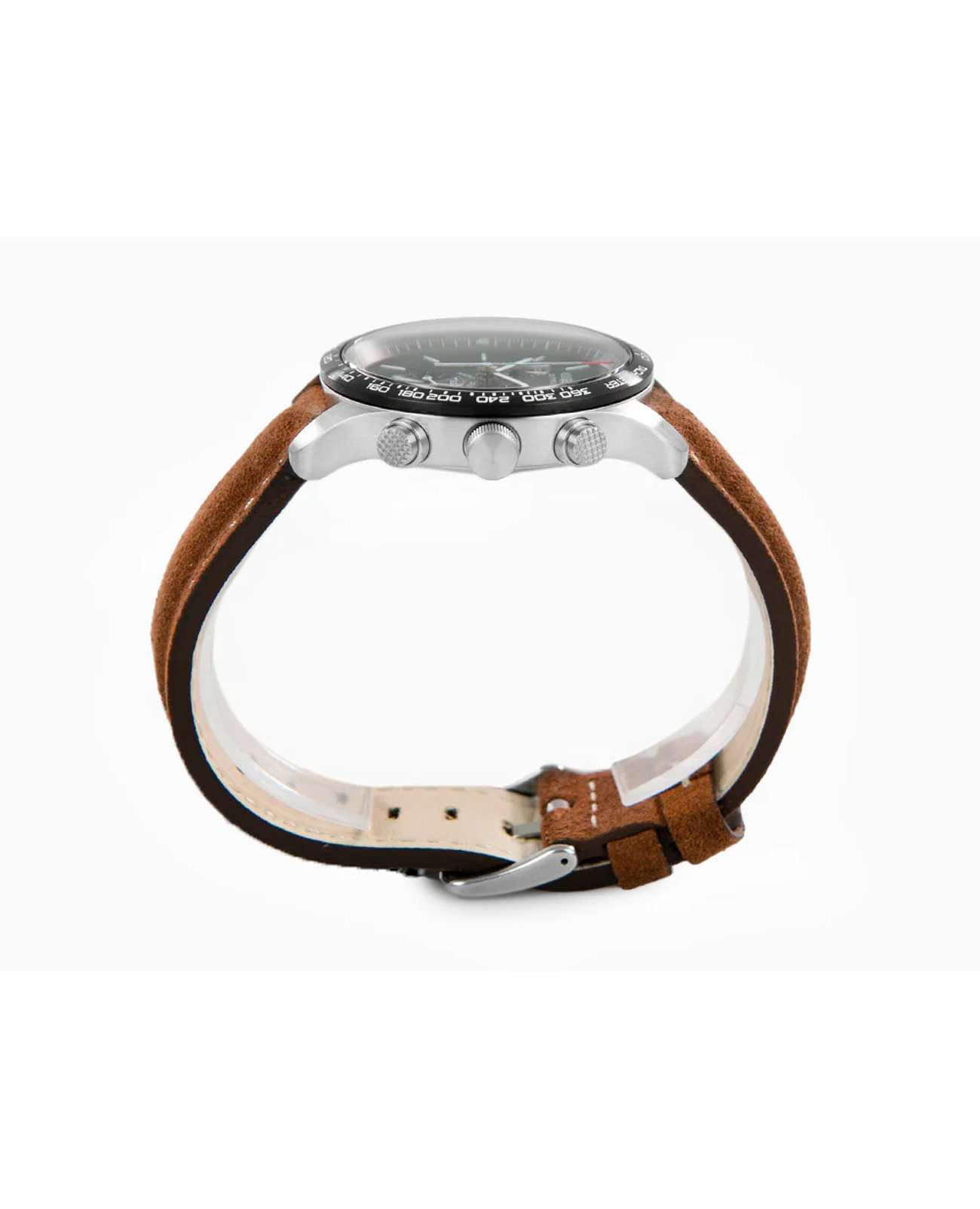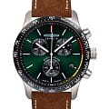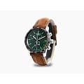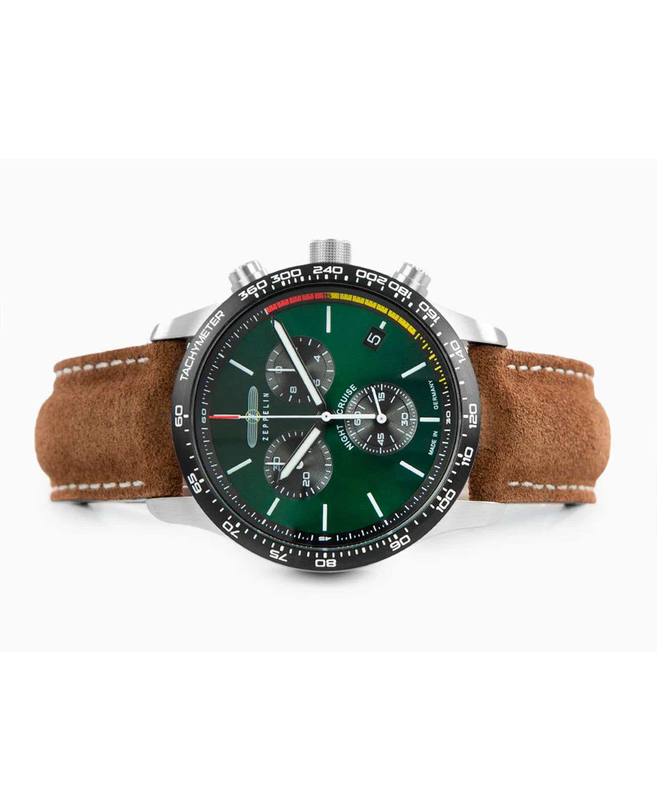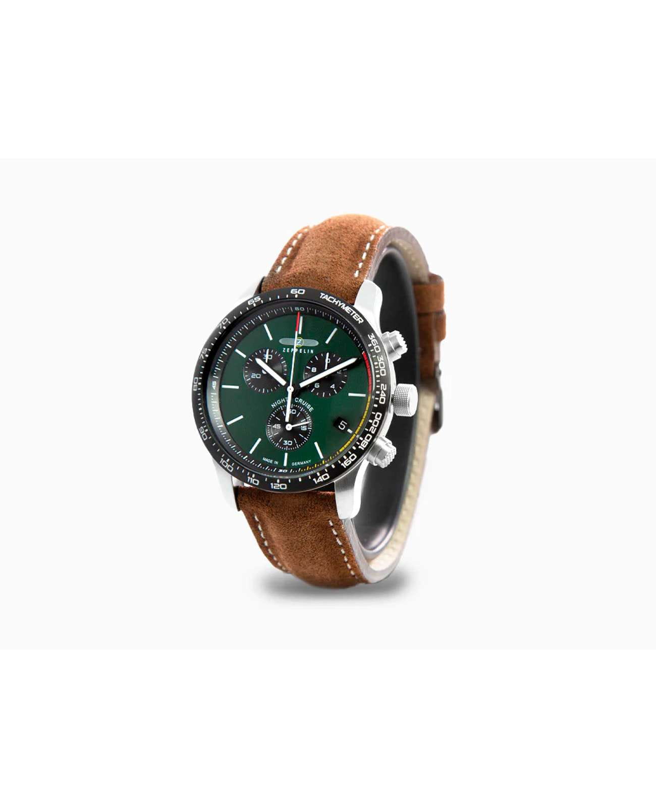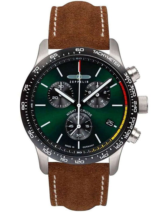 Мужские наручные часы-хронографХронографФункция позволяет измерять отрезки времени с особой точностью: часы, минуты, секунды. Верным признаком хронографа является наличие на циферблате 3 дополнительных окошек-счётчиков. Zeppelin Night Cruise 72884 сочетают в себе спортивный дизайн и функциональность. Модель обладает круглым корпусом диаметром 42 мм, изготовленным из нержавеющей стали, что обеспечивает высокую устойчивость к внешним воздействиям. Браслет выполнен из коричневой кожи с классической застежкой, гарантирующей комфортное ношение и стильный внешний вид. Зеленый циферблат оснащен шкалой с тахиметромТахиметрРазмеченная шкала, располагается на ободке или безеле часов. Тахиметр позволяет рассчитать скорость на определённом участке пути, расстояние измеряется в километрах или милях. по краю и дополнен малым секундомером, а также окном даты на позиции «4 часов». Для защиты используется минеральное стеклоМинеральное стеклоМинеральное стекло представляет собой искусственно выращенный минерал кварца. Такое стекло отличается особой устойчивостью к повреждениям и царапинам. Уступает по некоторым качествам сапфировому стеклу. с антибликовым покрытиемАнтибликовое покрытиеСлой оксида металла в 0,13-0,3 микрон, благодаря которому стекло часов не бликует и не отражает свет. Антибликовое покрытие уменьшает отражение света в 10 раз, обеспечивая отличную читаемость показателей циферблата., обеспечивающее прочную защиту от царапин и оптимальную видимость циферблата даже при ярком свете. Часы работают на кварцевом механизме ETA G10.212, который гарантирует точное время без необходимости подзаводки. Водонепроницаемость часов достигает 10 атмосфер (100 метров), что позволяет использовать их во время плавания и других водных видов спорта, однако не рекомендуется для глубоководного дайвинга.